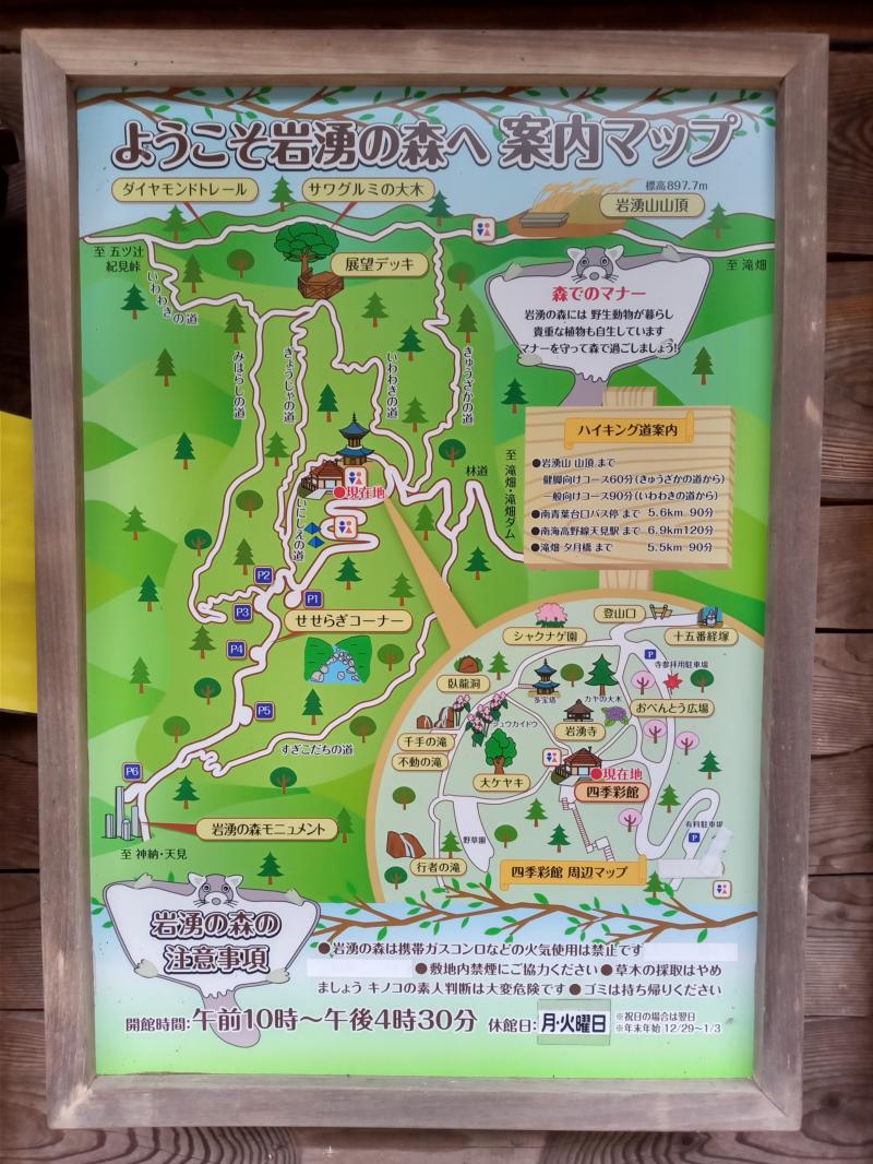- 岩湧の森駐車場(15分)いわわきの道分岐(30分)展望台(55分)岩湧山(50分)岩湧の森駐車場 【コース合計 2時間30分】