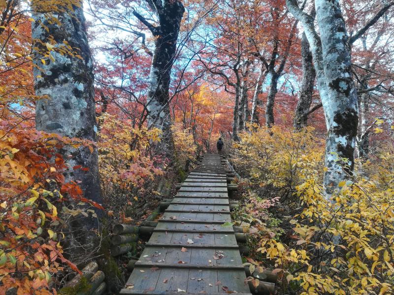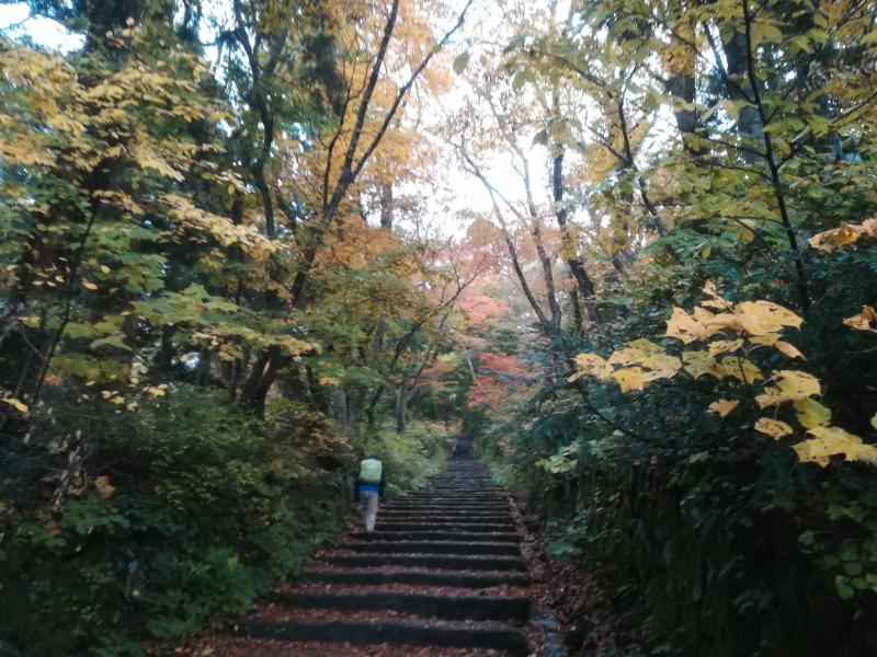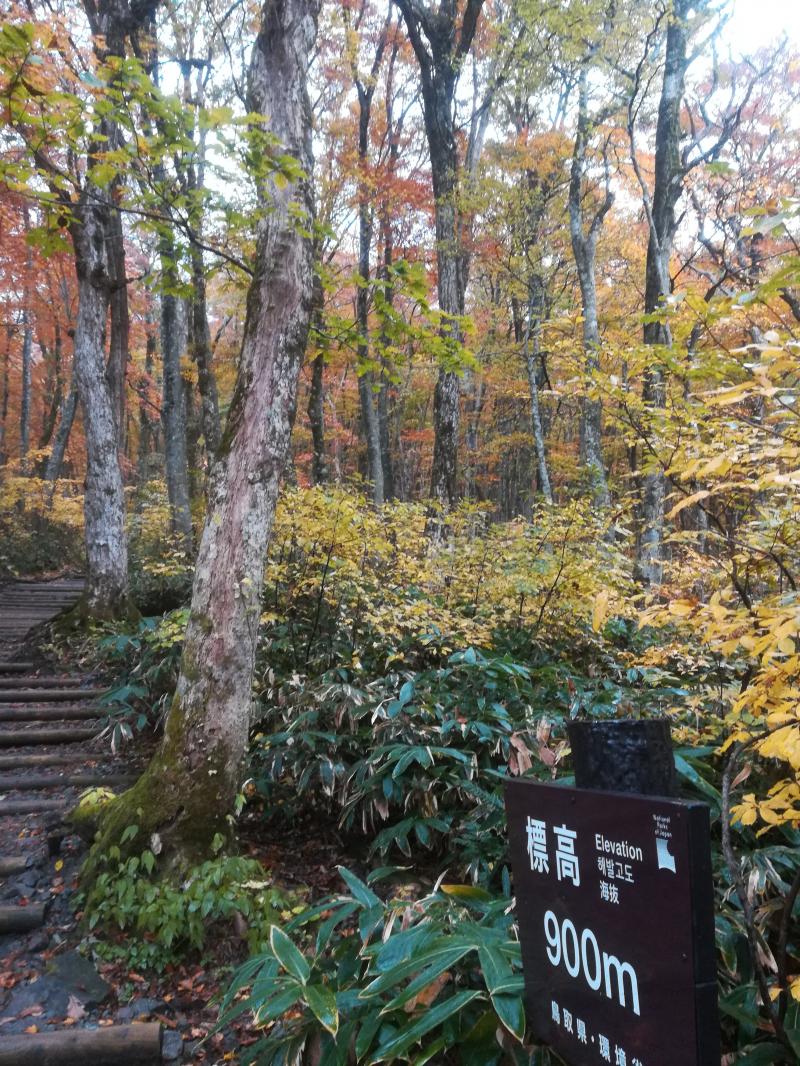 コースは登りは夏山登山道で。1合目からすでに紅葉が始まっていてわくわくしながら登りましたが、1000m前後が見頃でした。