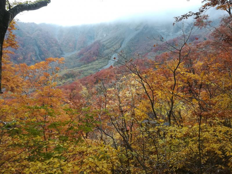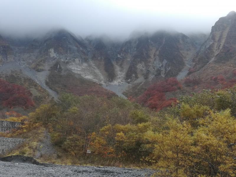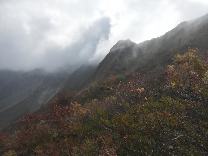 展望はダメでしたが、せめて紅葉でもと、6合目過ぎてから行者コースで元谷に下山。