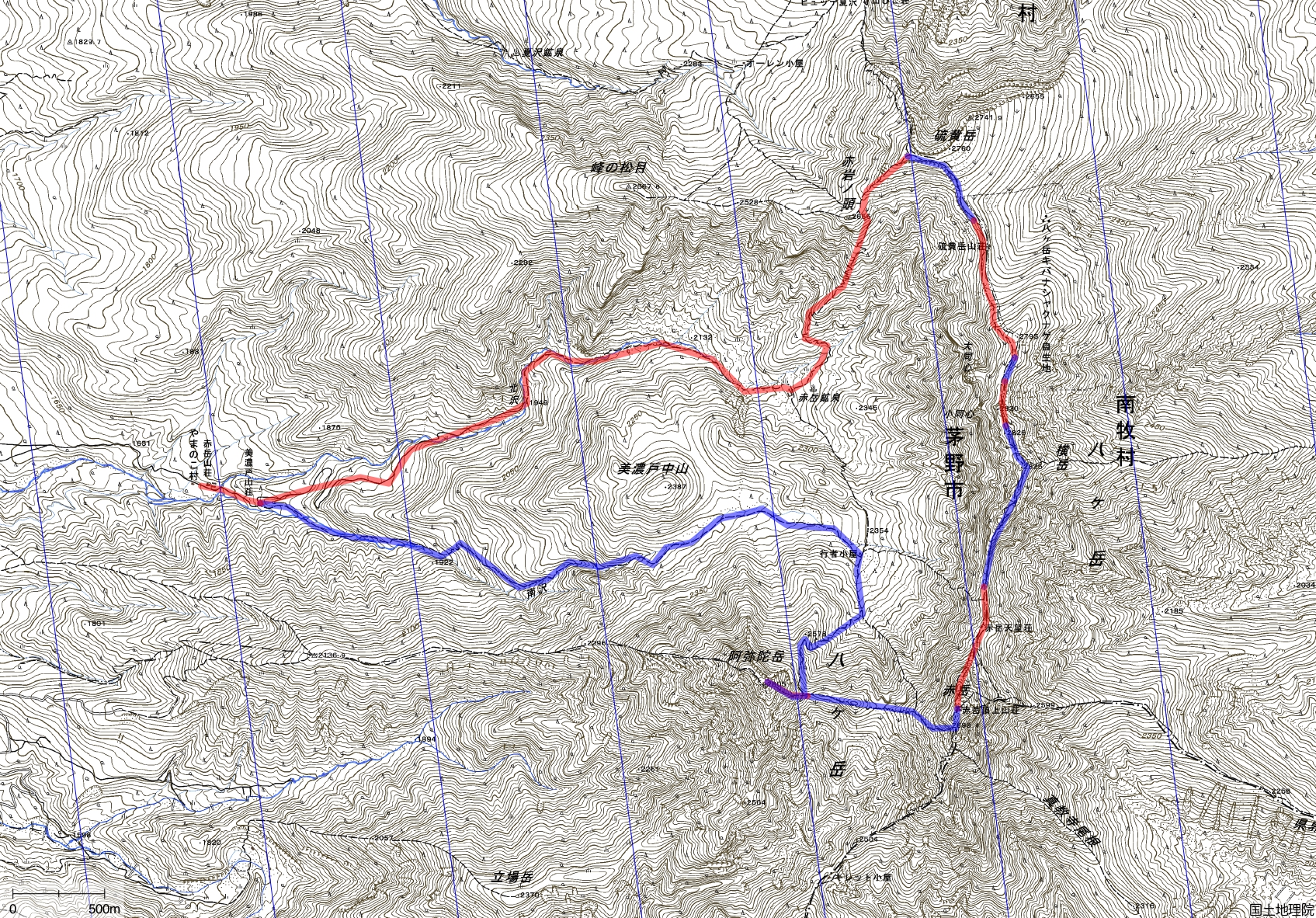 - 赤岳山荘ー(2:00)赤岳鉱泉ー(2:00)硫黄岳ー(1:20)横岳ー(1:50)赤岳ー(1:40)阿弥陀岳