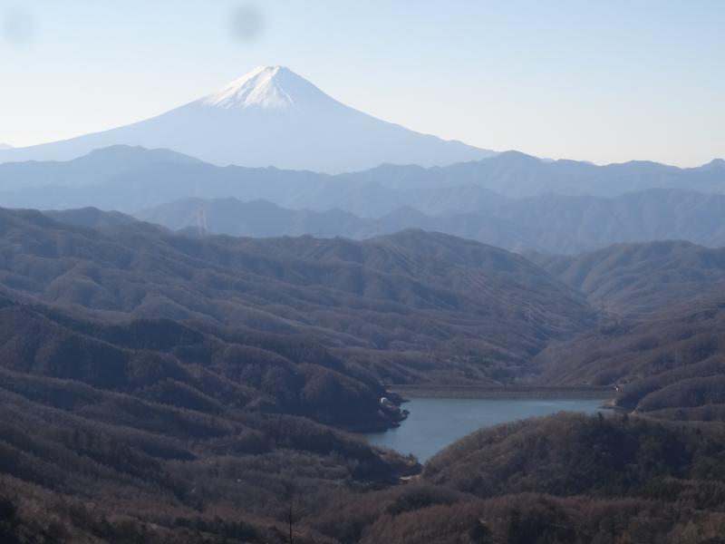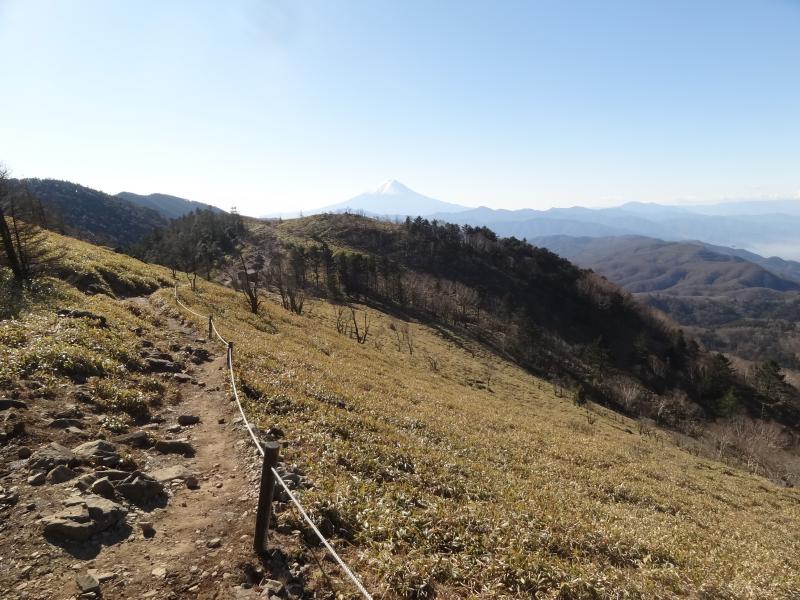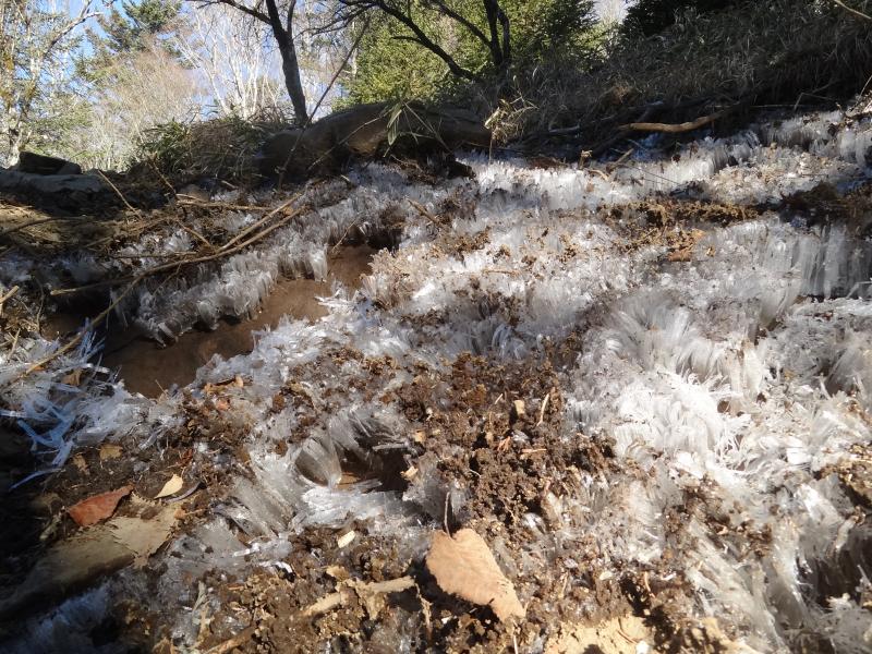 福ちゃん荘へ向かう登山道は大きな霜柱で覆われていて、まだ気温が上がらない時間帯で一桁台でした。左回りの周回で唐松尾根を登っていきますが、今日は風が強く、ぽかぽか陽気ではありませんが快晴で富士山の展望は良好です。大菩薩嶺自体は展望がないですが、介山荘へ向かう稜線は常に富士山の展望があり、しかもなだらかなで快適な稜線のはずですが、溶けた霜柱で湿った上に粘土質の土壌は靴にへばりつき、何でもないところでスリップする登山道で嫌な感じです。あちこちでスリップ跡があり、皆さん同じ箇所で滑っているのがわかります。