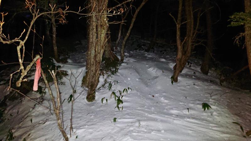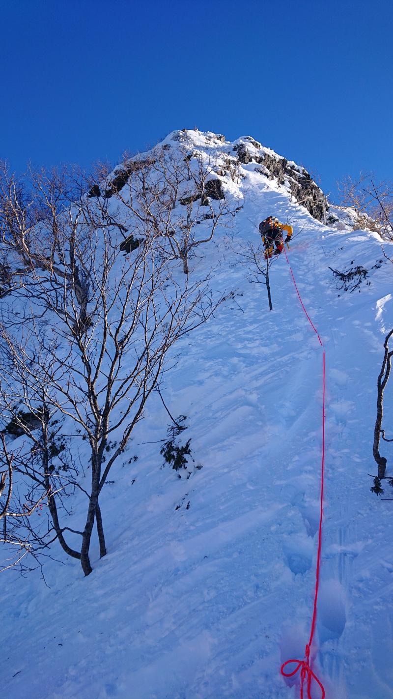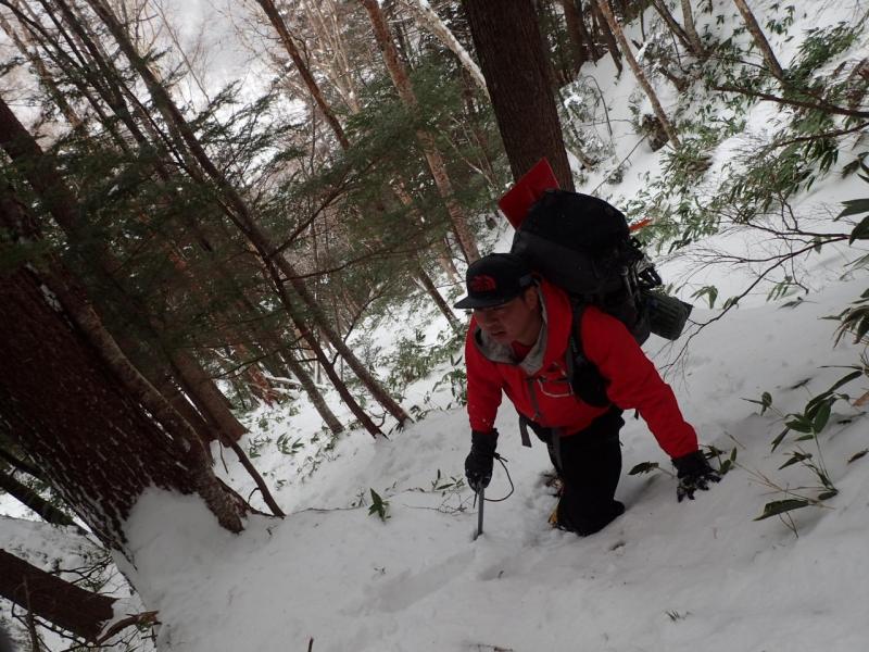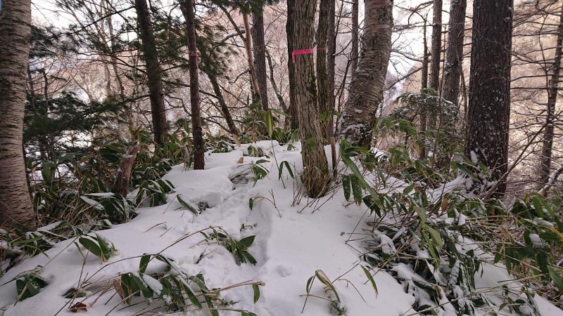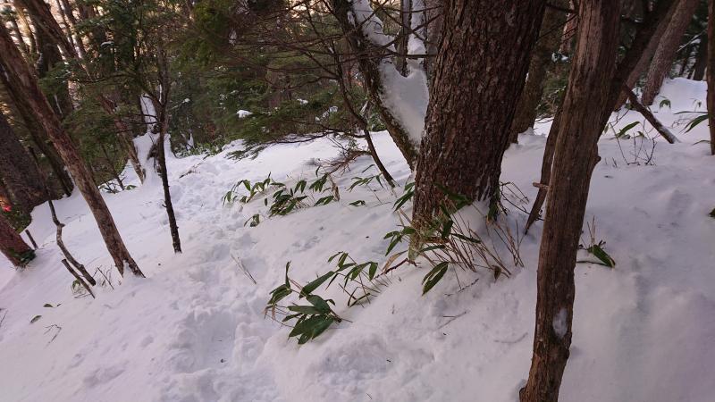 下部は笹薮が出ていて、かなり歩きづらかったですが少し進むと雪がしっかりとついていてサクサクと歩いて行けます。