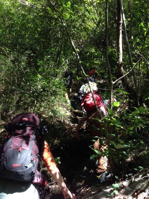 2日目、びしょびしょに濡れたフィックスロープを下降器で降りていくとシズクが跳ねて服がかなり濡れます。雨上がりの時も雨具必携です。
