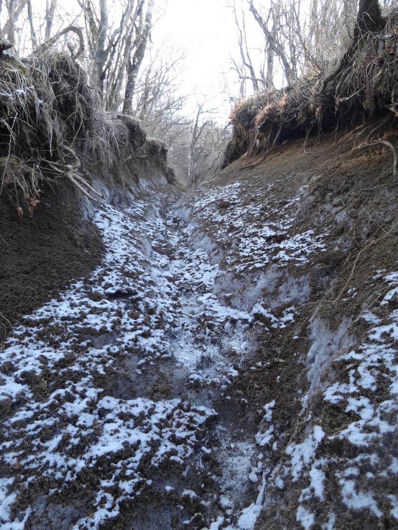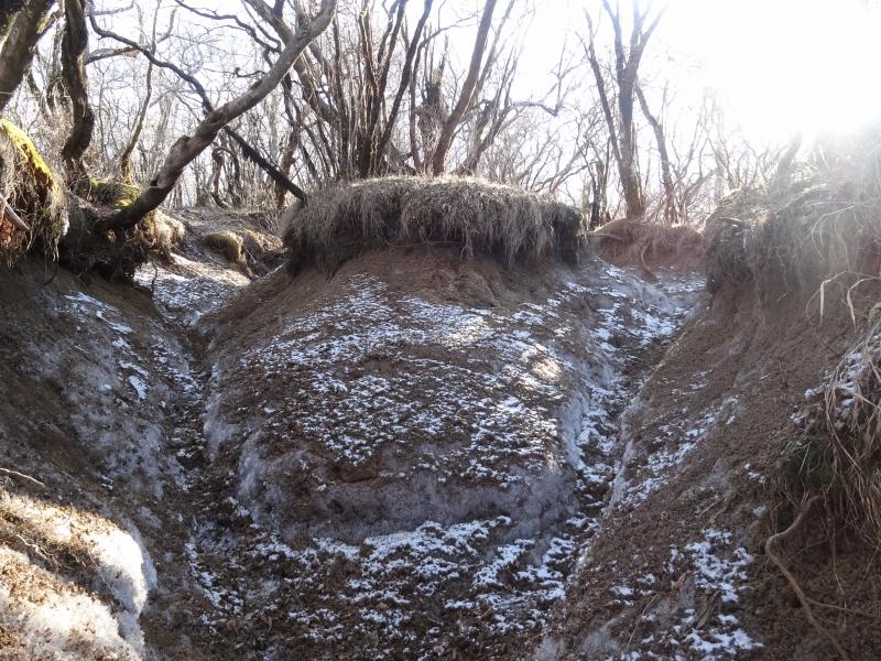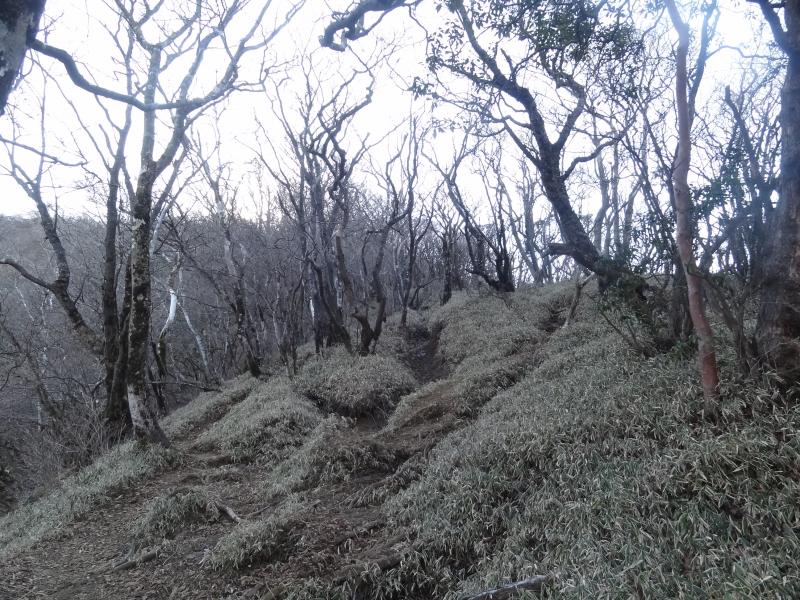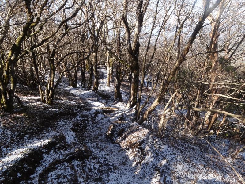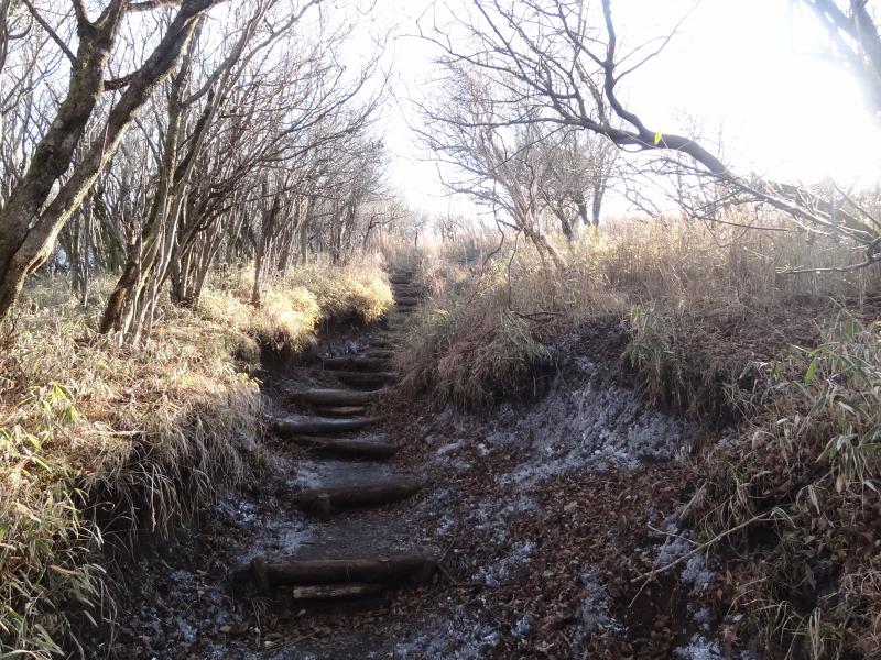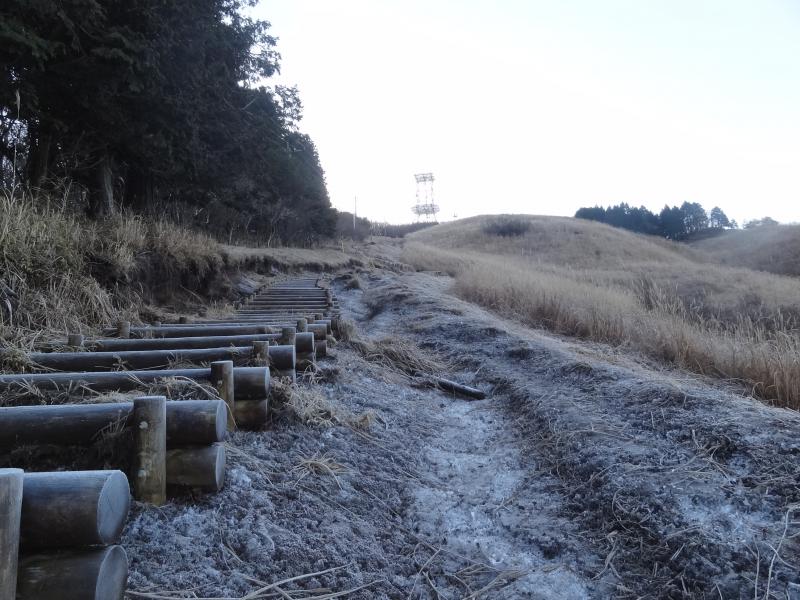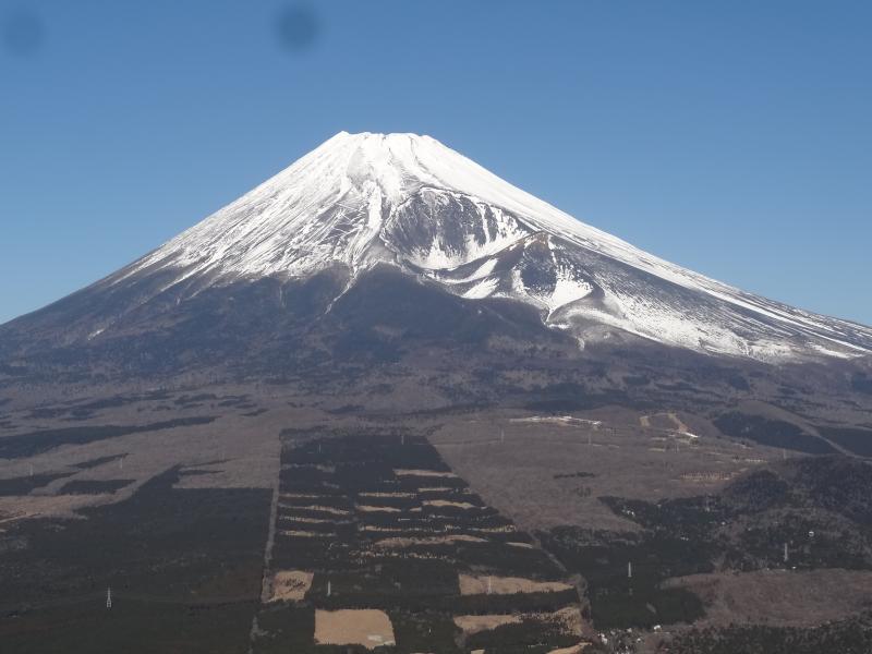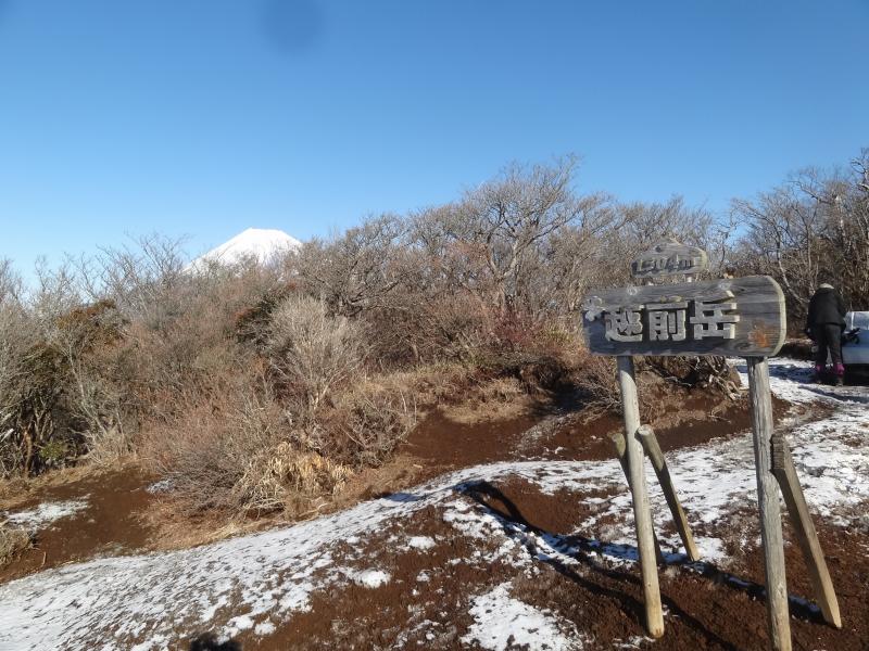 今回はあまり時間がとれないので越前岳の最短ルートの往復のみとしました。昨日と違い、まさに雲ひとつない快晴で、十里木高原登山口から階段を上がって、短時間で一つ目の展望台から絶景の富士山が拝めました。この先、樹林帯の中に入って行くので、ここでも十分、満足できそうです。登山口から既に霜柱状態が続きますが、上部は少しだけ雪が被っていて、昨晩、雪が降ったのでしょう。富士山の展望箇所が数箇所あり、その度に画像に収めましたが、途中では駿河湾も見え、いいとこです。樹林帯の中の登山道はえぐれた地形になっていて、それを回避した登山道が枝分かれしていて、どこを通るかは判断次第といった所です。山頂からは前の樹林がやや邪魔して、富士山の展望はもう一つですが、海側の展望はばっちりです。現在、通行禁止(迂回路あり?)の鋸岳への縦走路を覗いてみましたが、かなり下降していくようで見た目は確かに脆そうな地形には見えました。予定では越前岳から少し先の富士見台にも行くつもりでしたが、展望は十分楽しめたのでカットしました。今回の十里木高原コースは手頃で歩きやすかったですが、また次回、来るときは黒岳方面にも登って見たいです。