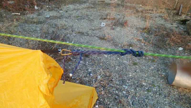 8mmの補助ロープなので7mmの細引きで「ダブルフィッシャーマンズノット」でスリングを作り「クレイムハイスト」でツエルトを引っ張ります。