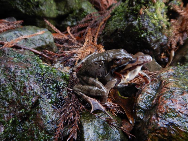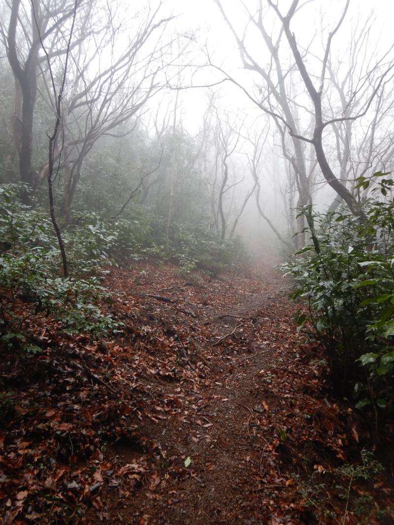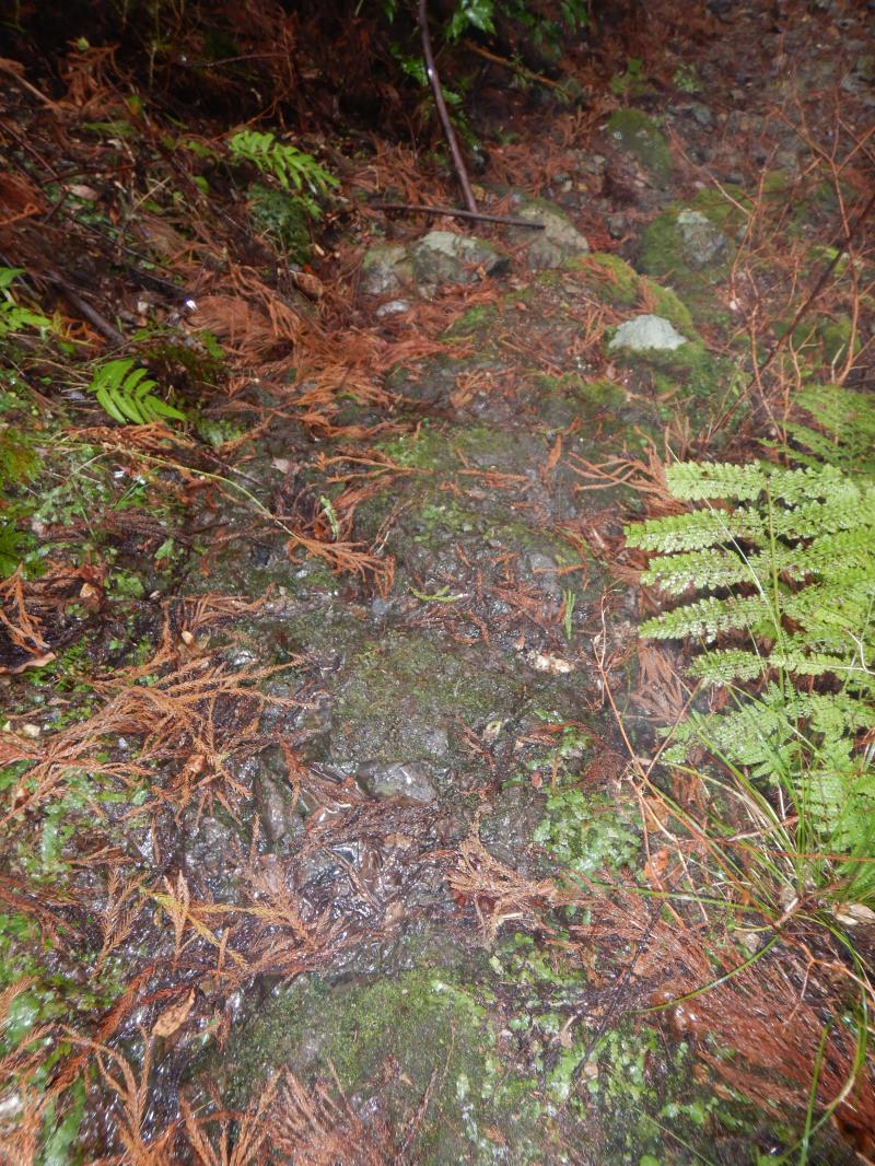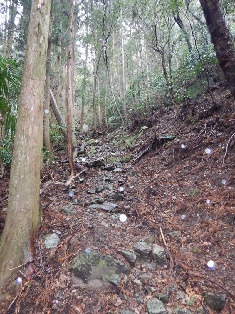 ところどころに岩が剥き出しになっており、かといって階段状になっているわけではなく、トレイルの7割くらいがスロープ(坂道)状。そこに枯れ枝や枯れ葉が積り、滑る要素しかありません。登りはまだいいのですが、下りは難儀しました。