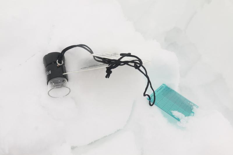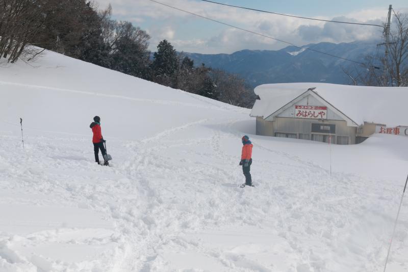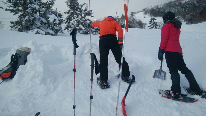 再び ビーコン捜索。ビーコンは送信方向と雪崩ビーコンが直角に交わると 左右対称に強い信号がでる。ここが難しい。