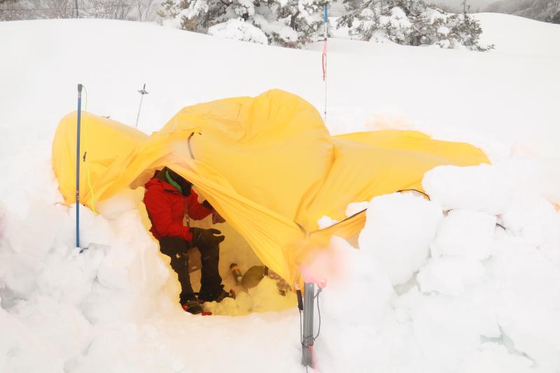 屋根にツエルトをプルーブとストックで止め廻りを雪で固めました。