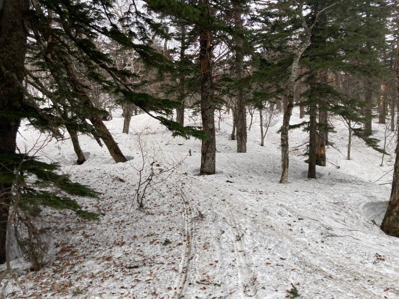 - 前日の降雨降雪からの冷え込みにより、標高700m以下はレインクラストによるアイスバーン。700mより上部は場所によって吹き溜まりとアイスバーンが混在している状況。標高1200mまでは二日前の登山時よりも厳しいコンディション。