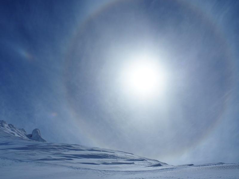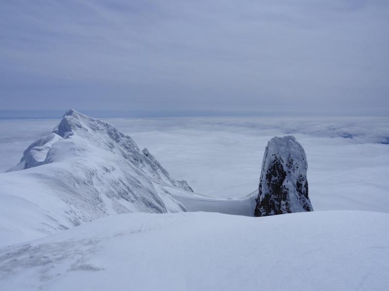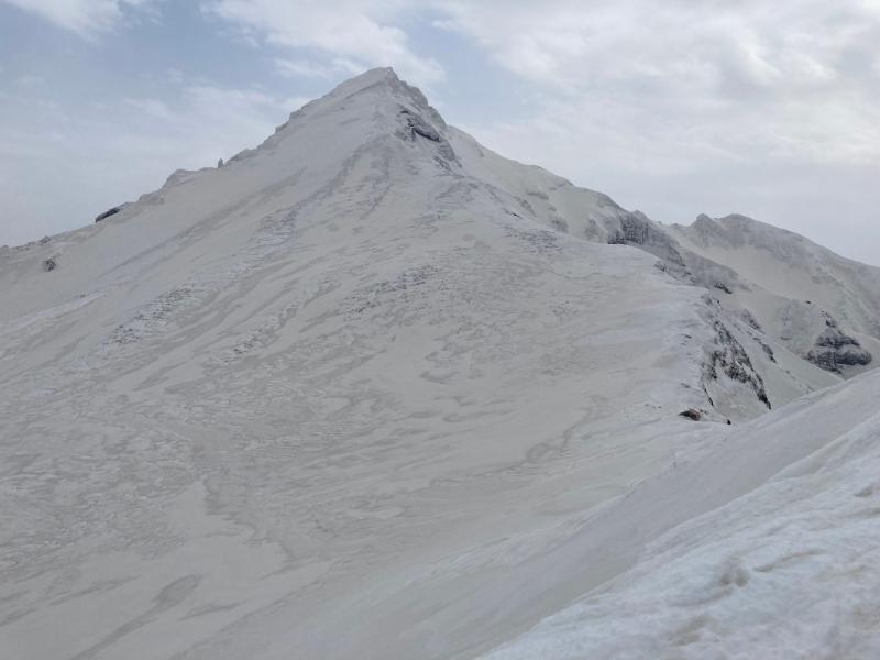 カチカチで緊張感のあるトラバースや、逆に足がズブズブ埋まってなかなか登って行けない斜面を粘り強く登る事、約2時間!!