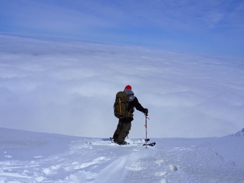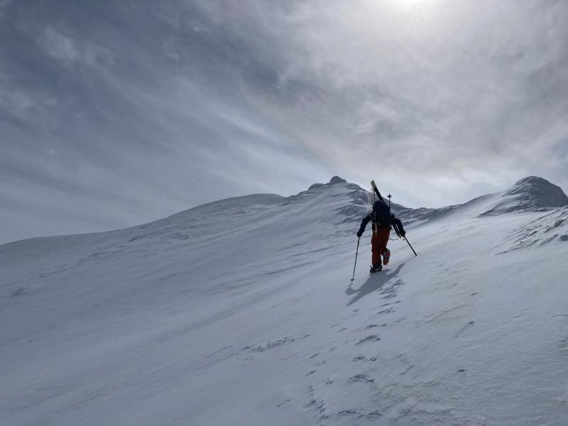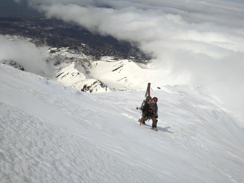 200mぐらいはシール登行できたのですが、それ以降はスキーを担いでアイゼン&ピッケルスタイルです。