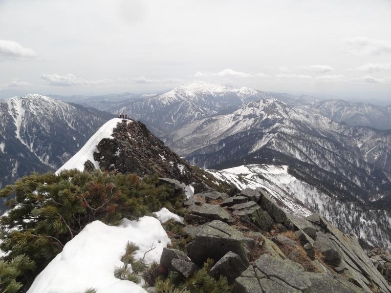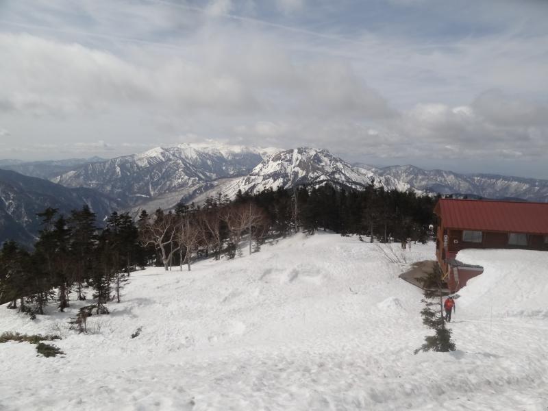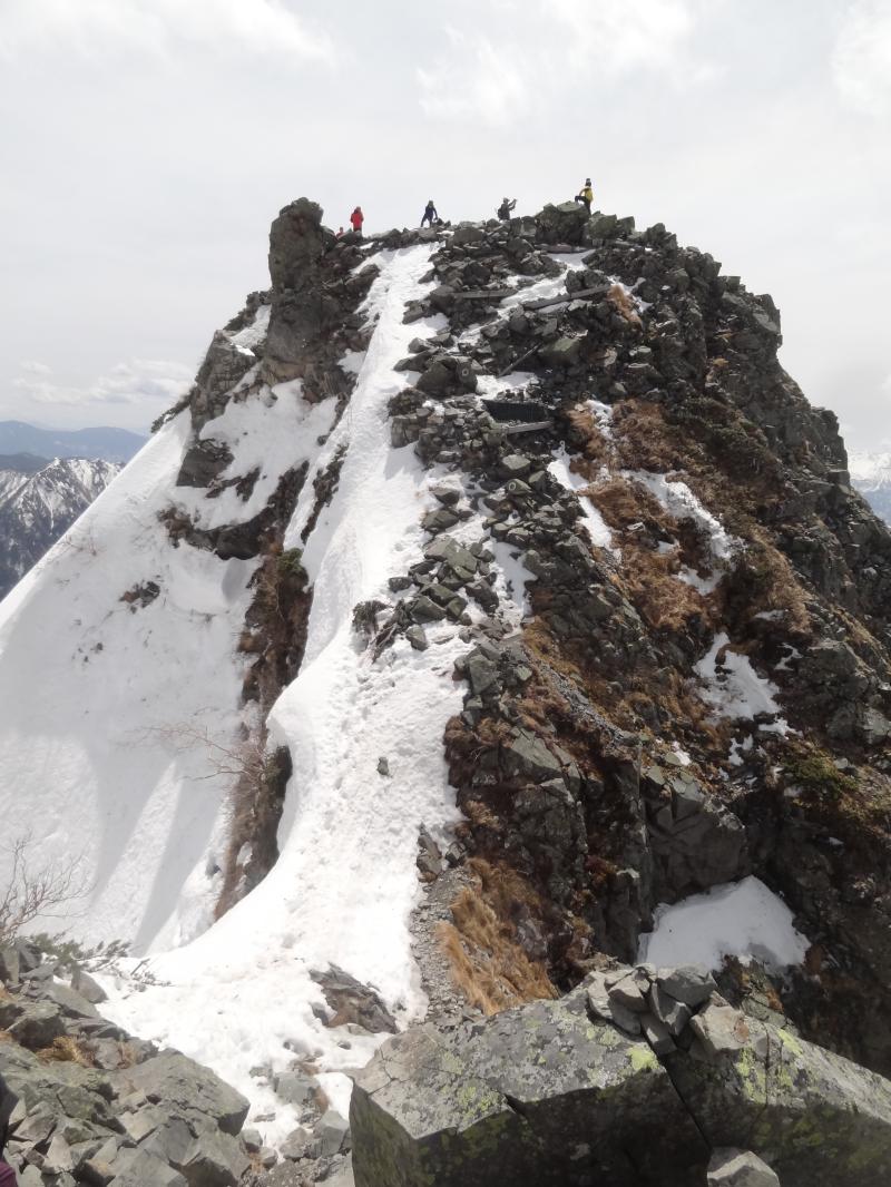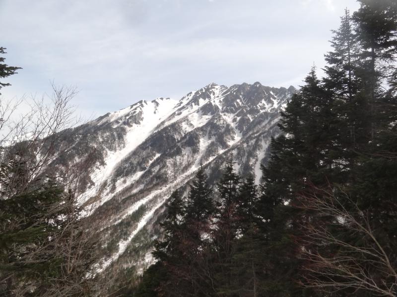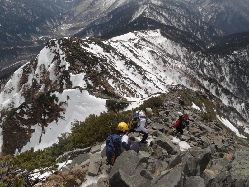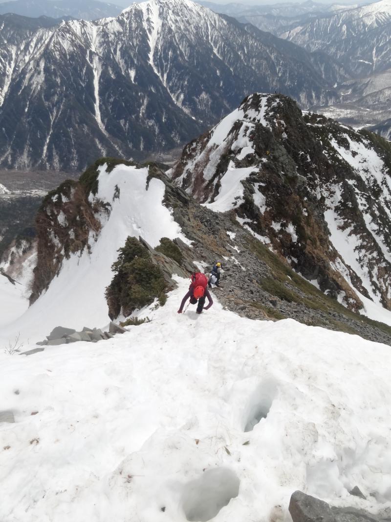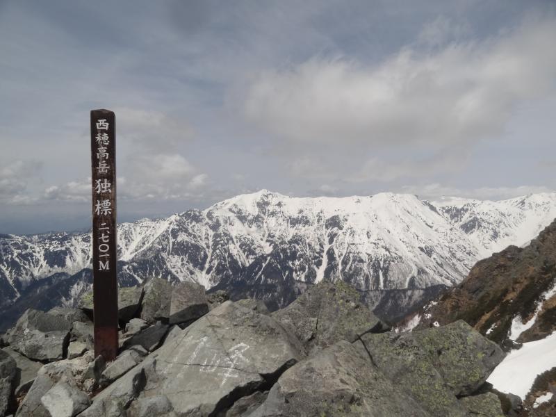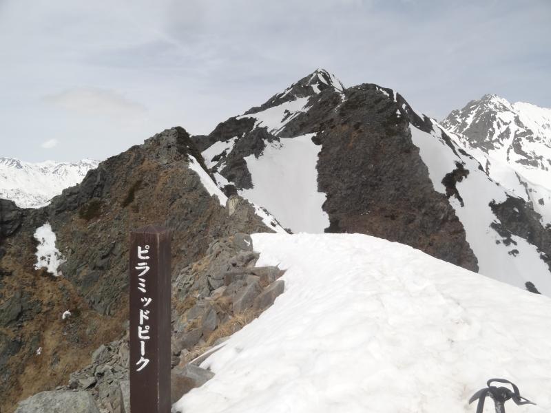 冬の間に登る予定を何度かあったものの天候が悪く、結局、春山になってしまいましたが、今日は天候がもちそうだということで登ってきました。本日の上り始発は8:30で、最終下りは16:30ですが、15:45には乗る必要があるので7時間の持ち時間がありますので、独標先は行けるところまでの予定。平日ということで始発は4パーティーほど、当然ながら西穂高口駅から既に雪がまだまだあり、私以外はアイゼン装着。西穂山荘まではトレースを外さなければしっかりした道ができていて、景色を見ながら沈まず快適に進み、一番乗り。ここ何日か天候がよく、雪は熔けてしまい真っ黒の稜線が見えます。丸山から見て、雪の上を歩くのか夏道を行くのかわからず、とりあえずここで私もアイゼンを装着しましたが、雪の上は埋まりまくって、結局、アイゼンなしで夏道を進んだ方が賢明だった。この先の独標手前の岩場にも雪がなく、完全にアイゼントレーニーングになってしまった。西穂山荘まではアイゼンが欲しくても、丸山~独標まではアイゼンが不要だったような今日の状況ですが、アイゼンを装着して歩くとなると嫌な感じしか残りません。