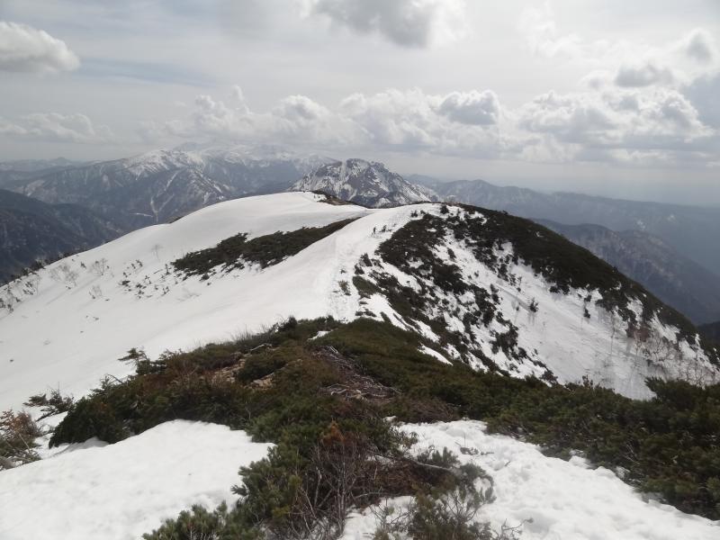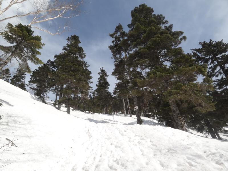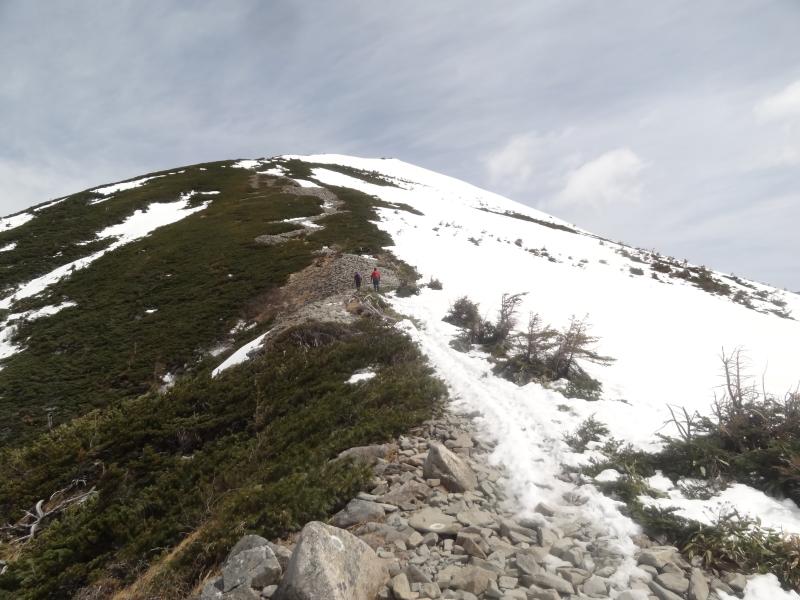 ⑦丸山からしばらく右側のハイマツ帯に雪、左側が夏道ですが、雪道ははまります
