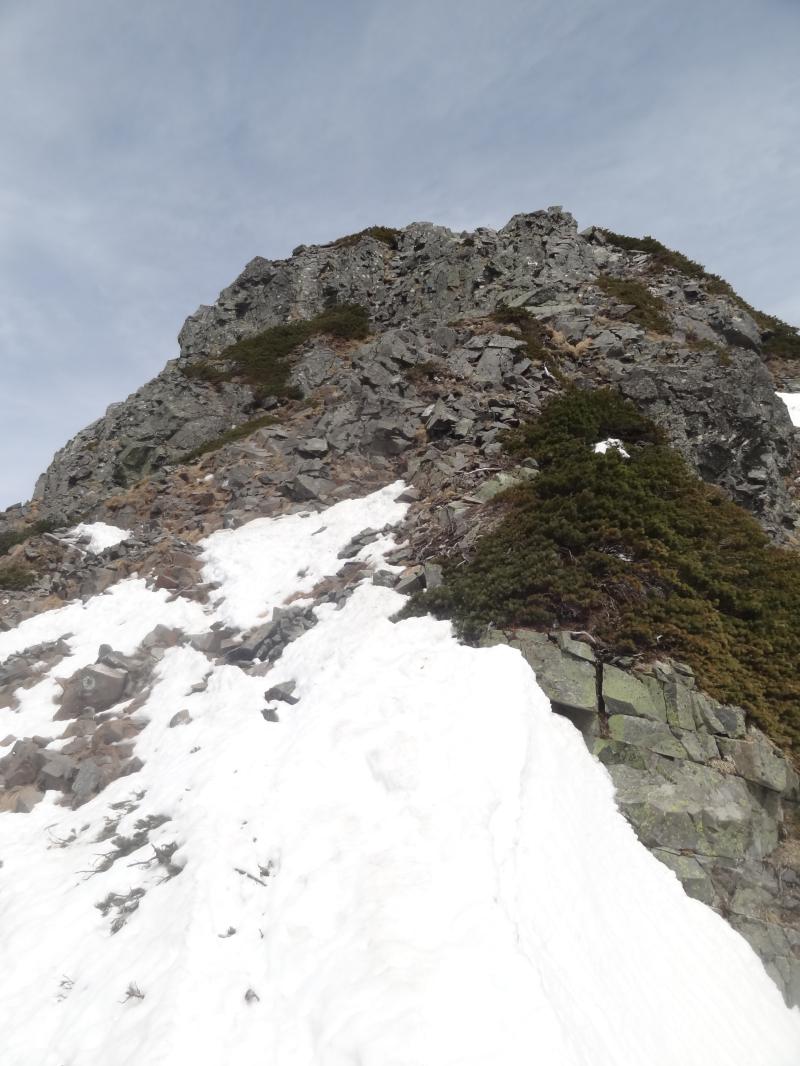 ⑧独標手前に岩場があり、本日は全く雪なしで夏の鎖場が上部にあります