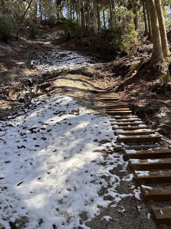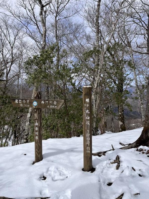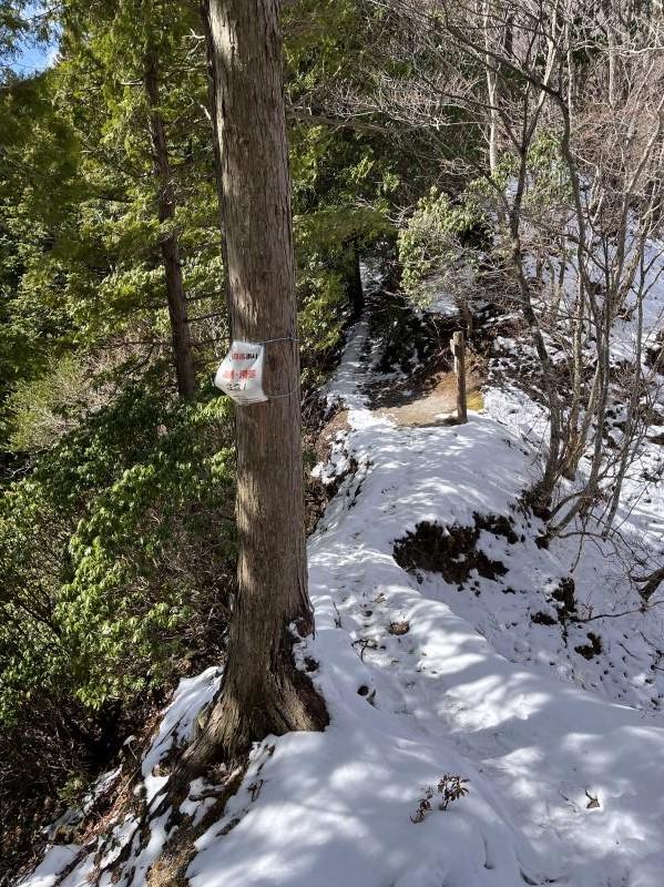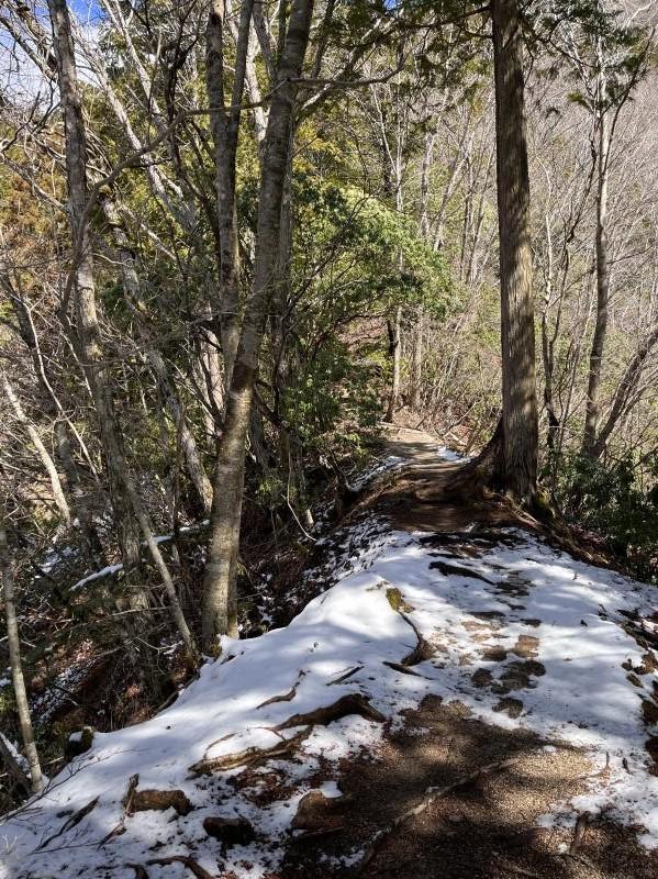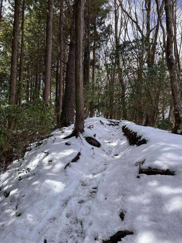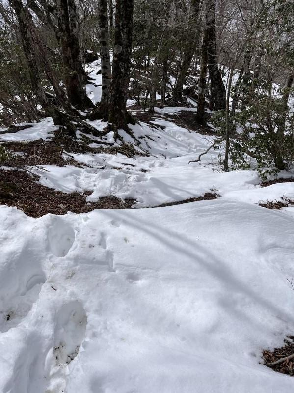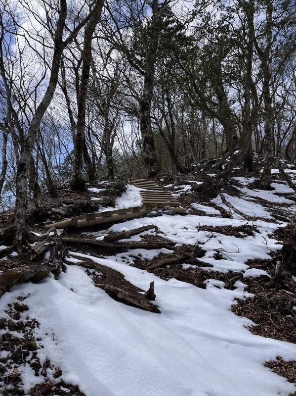 今日は山頂直下に残雪がありました。アイゼンを使用するほどではありませんでしたが下りは滑りやすくなっていました。細い尾根道には注意が必要です。
