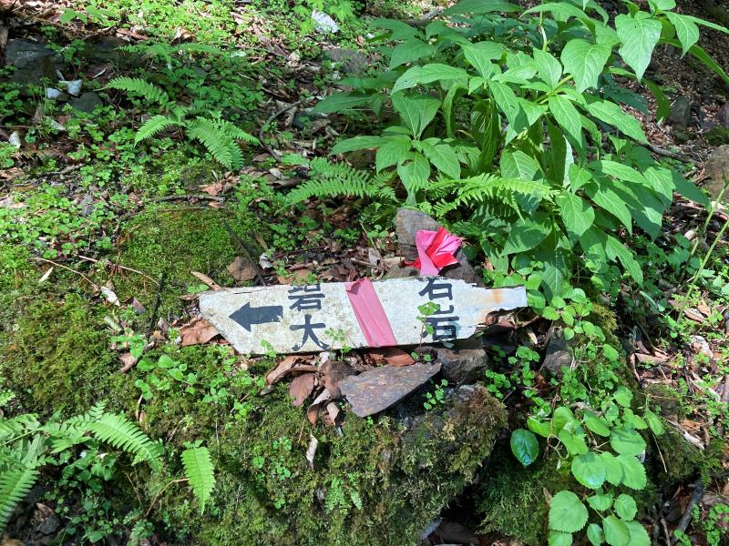 朽ちた道標が所々ありますが、ピンクテープを目印に進みます。