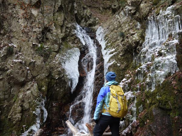 - ・紅葉谷出合から幕滝経由は切り立った崖の足元が凍結しており軽アイゼンを装着していても危険です。手前を左に巻いて七曲滝へ向かいましょう。