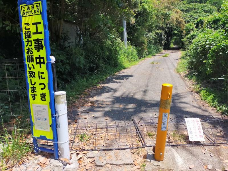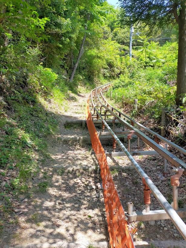 登山入口から半分は舗装路、半分は土道(階段)です。土道には工事用のモノレールの線路ができていました。