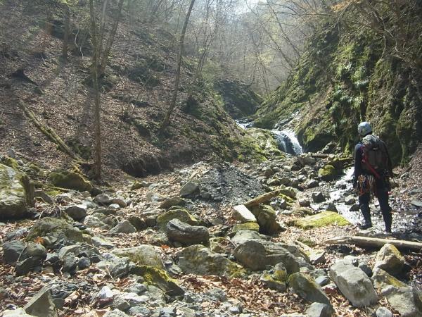その後はロープをしまい小さな滝を越えて行きます。一際大きなF8・30m大滝が現れたら右の急なガレ場へ方向転換。掴んだ岩はすぐに剥がれ足下も決まらず、ここも言わば核心、そっと静かに抜けるしかありませんでした。