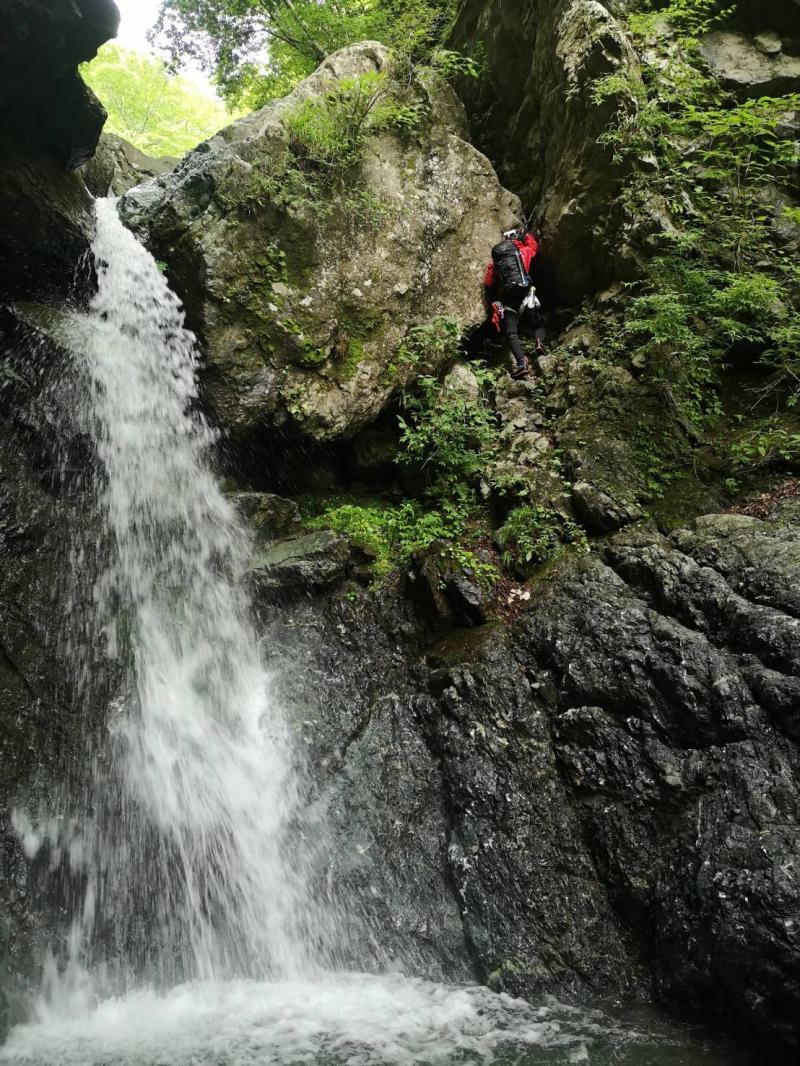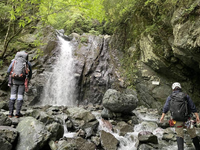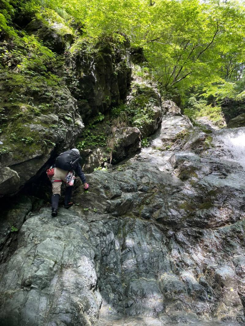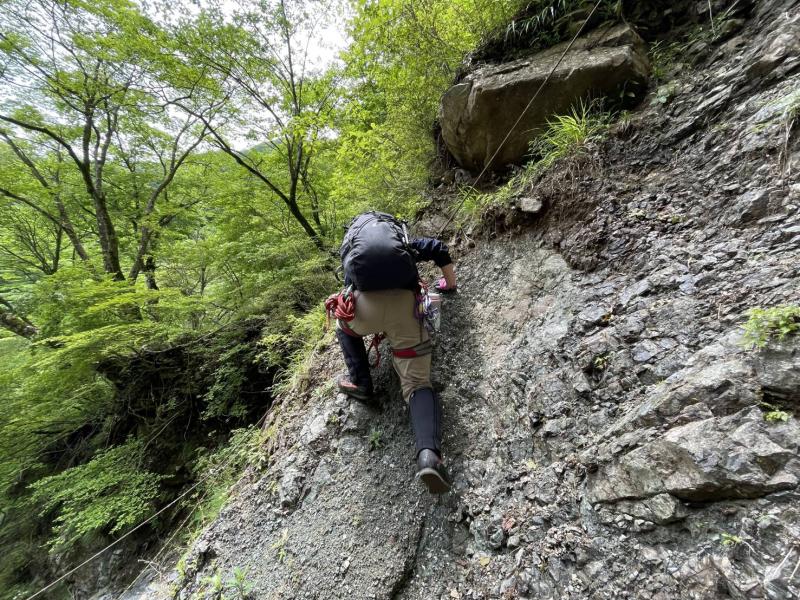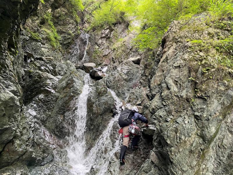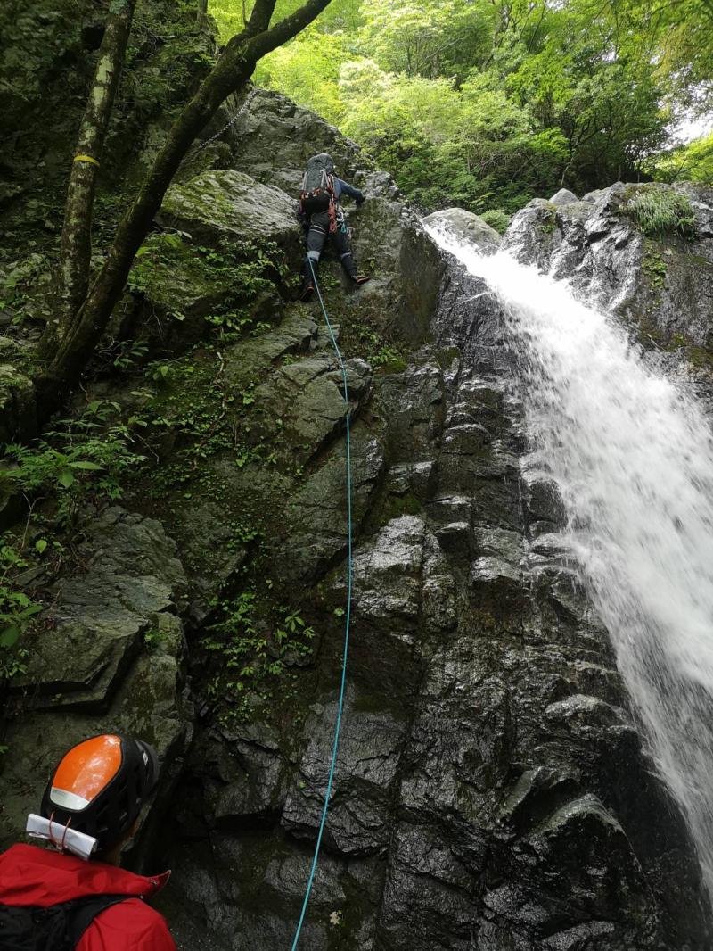 ・F1(10m)左壁登攀、F2(5m)右壁登攀ハーケン数か所、F5(2段8m)左壁鎖に沿って高巻き&トラバース、F6大チョックストーン(5m)残置アブミ&お助け紐登攀、F8大滝(30m)右ルンゼ高巻き