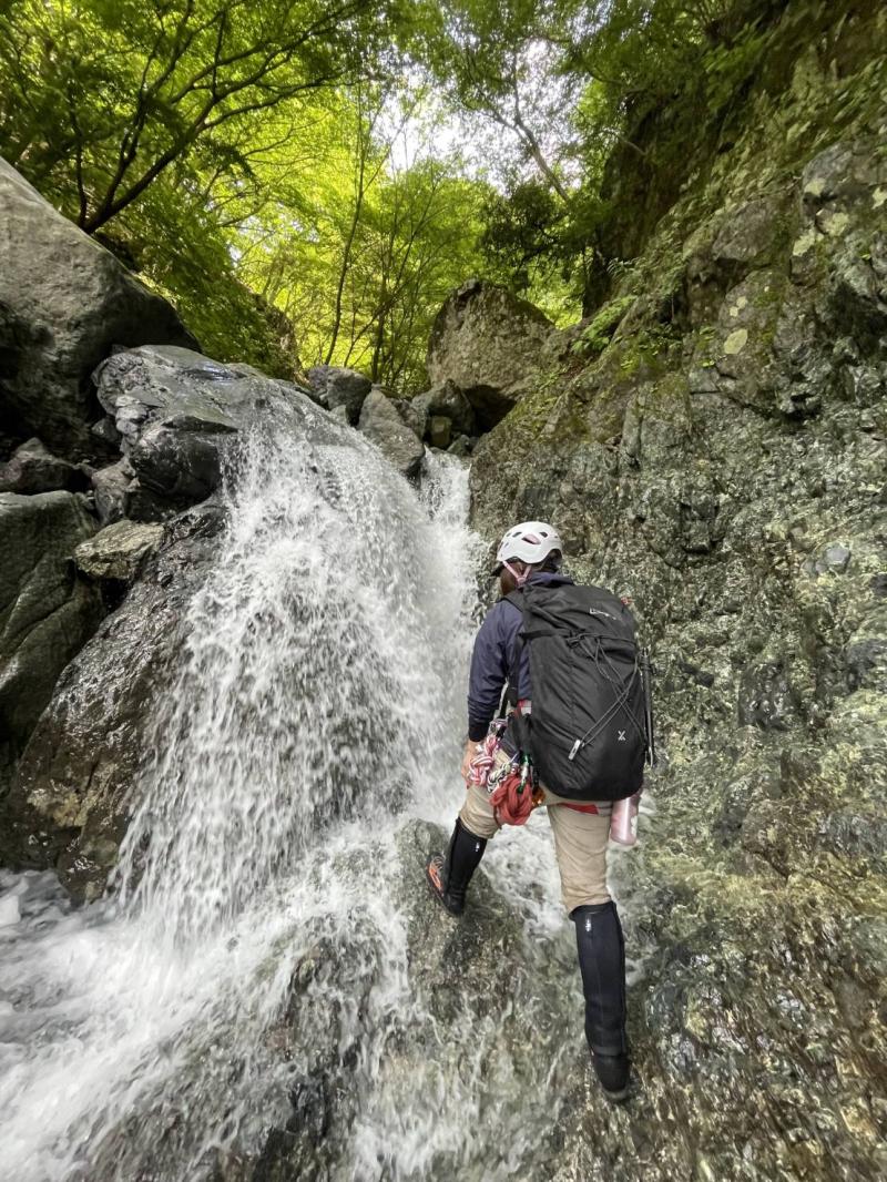 水無川本谷は初心者向けの易しい沢とされていますが、なるべく水線を通るようにとの指令。登攀以外はトップを任され、後から飛んでくるダメ出しに一喜一憂しながらの修行山行となりました。
