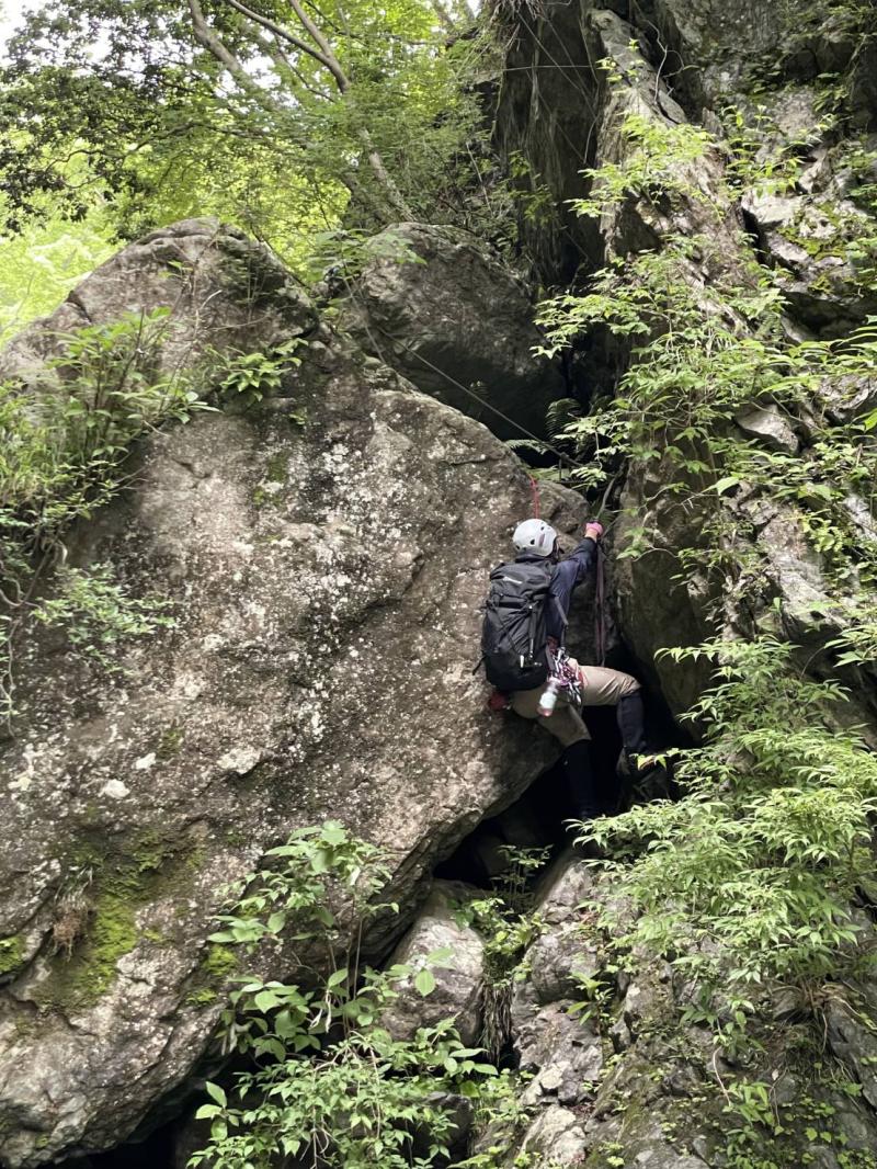 小休憩後は核心の大きなチョックストーンのあるF6滝。右壁との間にスリングが垂れておりそこをアブミにして登ります。やってみたい気持ちはありましたが、先はまだまだ長いのでここもお任せ。登ってみたらスリングになかなか届かず、手足の長いメンズに先に行ってもらって正解でした。お助け紐を駆使しながらなんとかトップアウト。一番の核心でした。