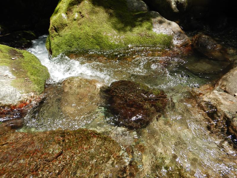 ゴルジュ部分を見ると、やや水が濁って透明度が低く泡が澱みに溜まっています。