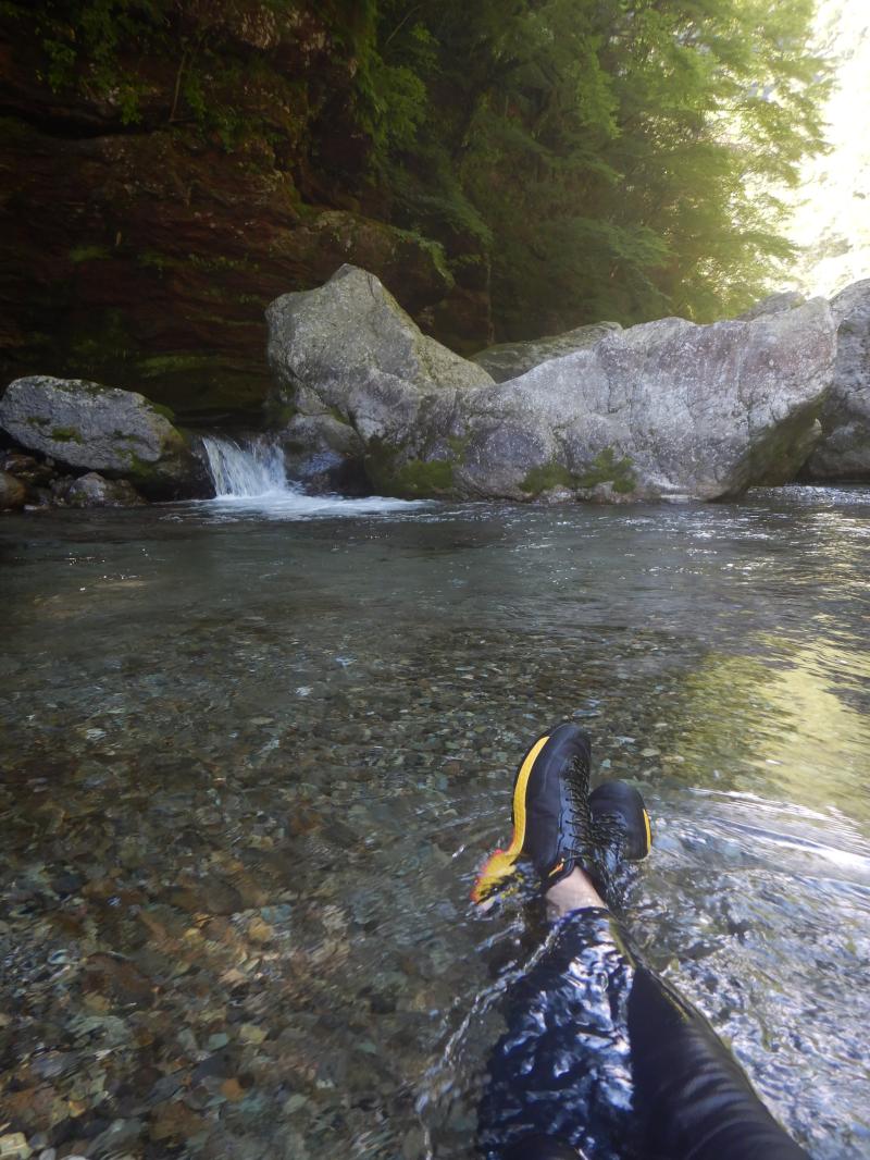 沢としては標準的な水温で、外気温(33℃)が高かったこともあって沢の中で水を浴びてもそれほど気になりませんでした。