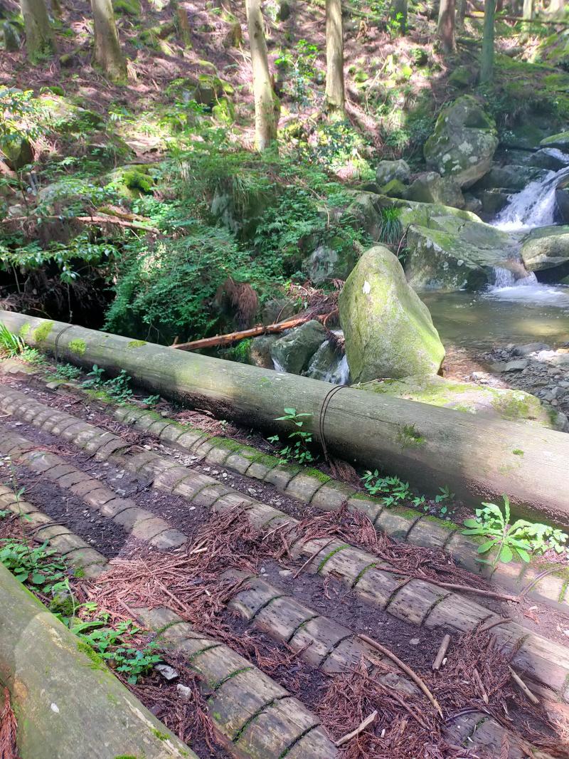 - 水の音を聞きながらの登山はとても涼しいです。高い木々に囲まれているので、登山道はほぼ日陰で涼しいですが、先日の雨の影響か、登山道まで水が流れているところ多々あり。ジメジメして滑りやすいところもあります。ヘビやヒルも遭遇しました。