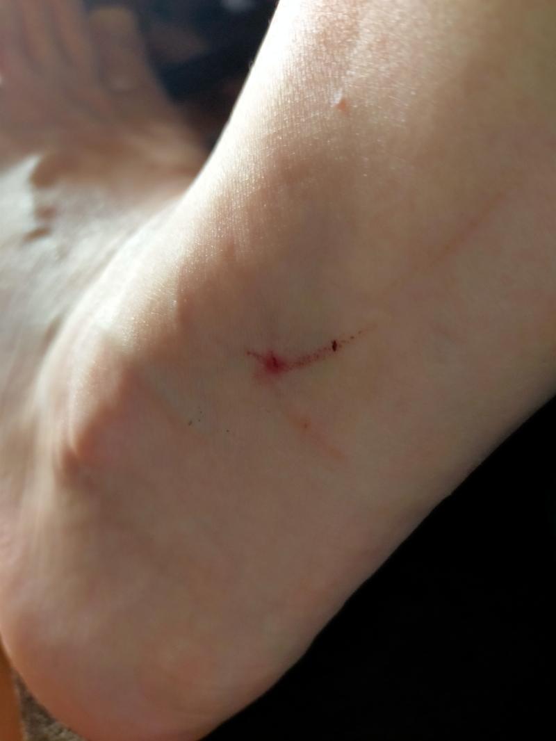 スパッツと靴下のほんの少しの隙間の肌に!びっくりしました!普段愛用しているスマートウールのくるぶし丈くつ下。ついつい癖で履いてしまいました。今日は間違いでした。