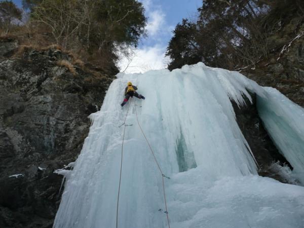 様々な滝の集まる戸台川流域のアイスエリア。今回は舞鶴ノ滝をメインに楽しみました。私たち以外に入山者はなく、天気も良く静かで気持ちいいアイスクライミングができました。仲間のリードでフォロー、トップロープを堪能させてもらいました。