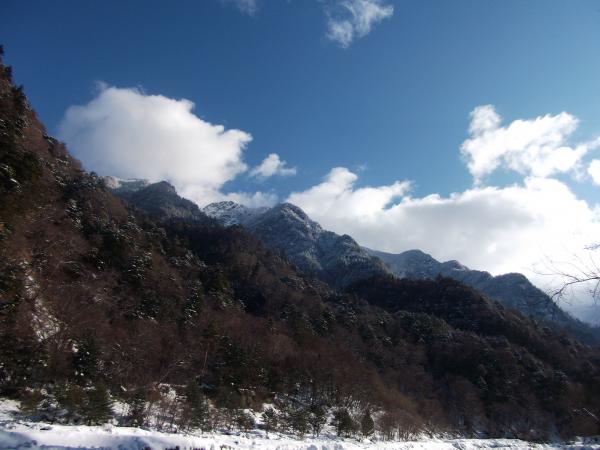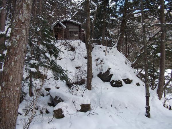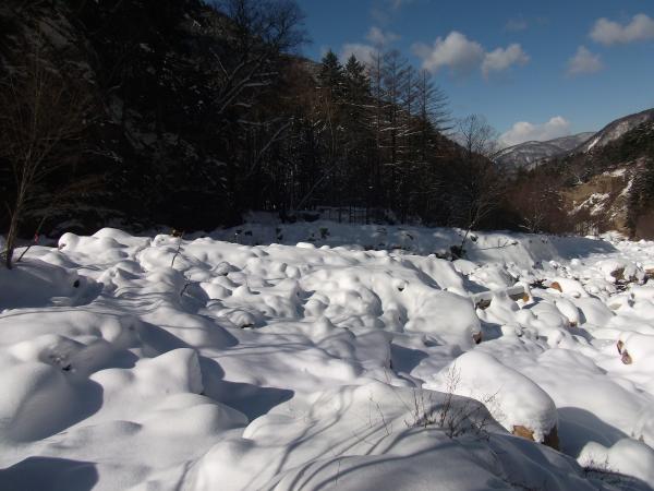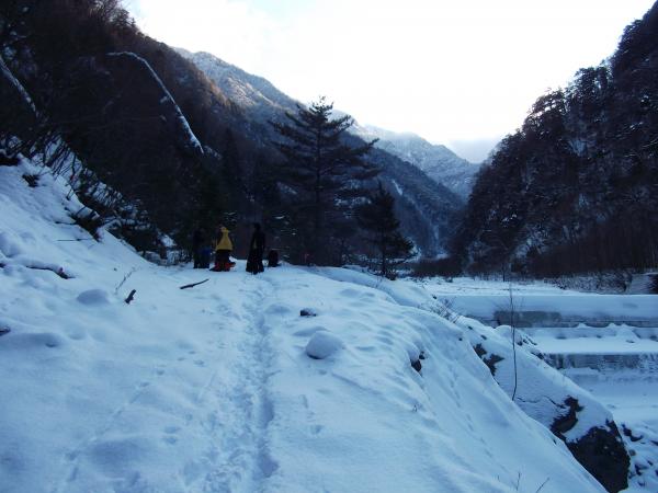 ・ベースとなる丹渓山荘までは、膝下程度の雪が積もっていました。基本は河原歩きです。