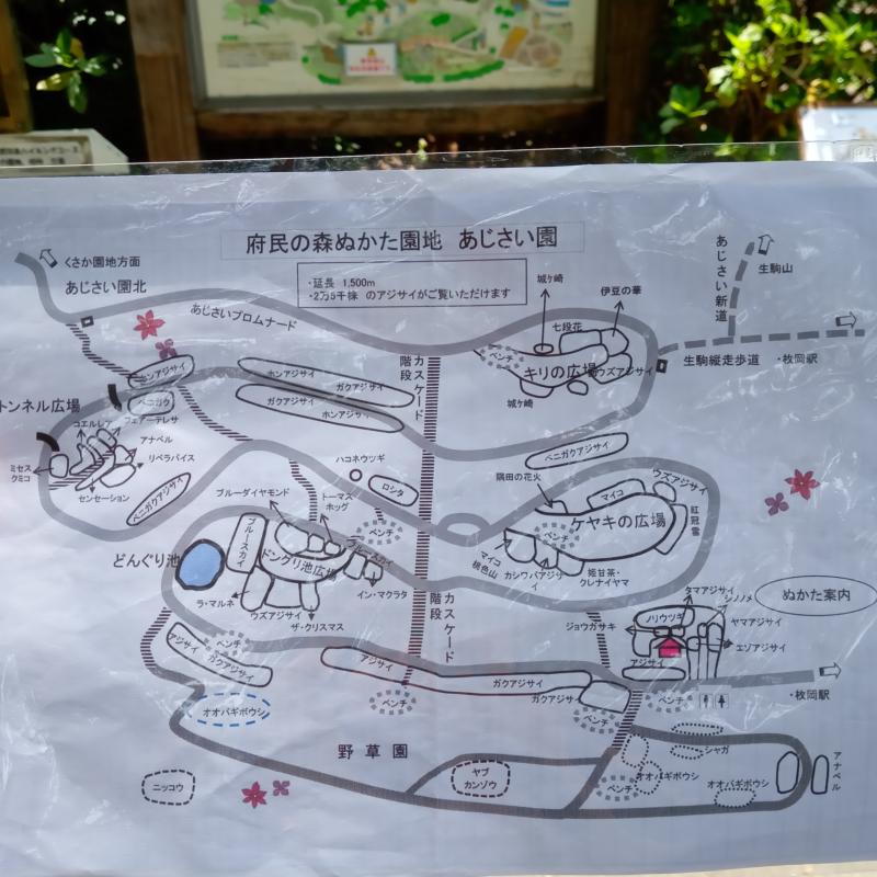 - 芝生の駐車場(30分)額田山展望台(60分)あじさい園(50分)額田山展望台(15分)芝生の駐車場 【コース合計 2時間35分】