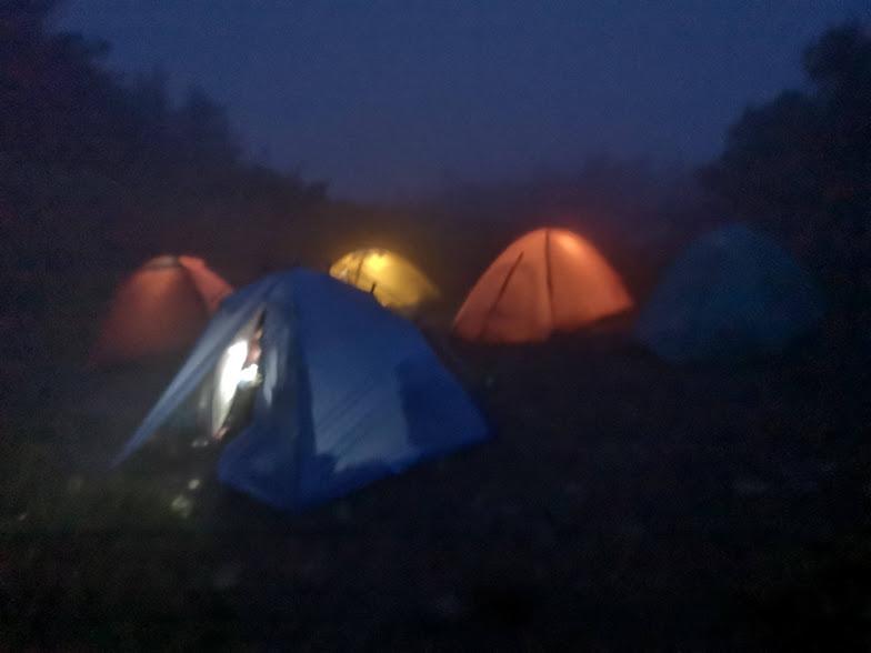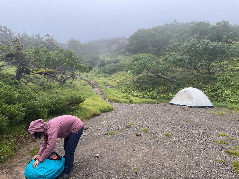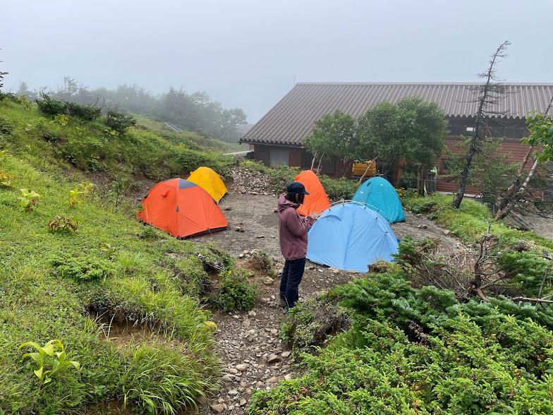 ・光岳小屋、幕営1張2000円。水場は小屋の南側崖下か静高平で汲めます。テント場は小屋前か小屋下の2ヶ所。小屋下は3分くらい下った場所で上よりも広め。小屋番さんによると雨の日は浸水する可能性があるとのこと。