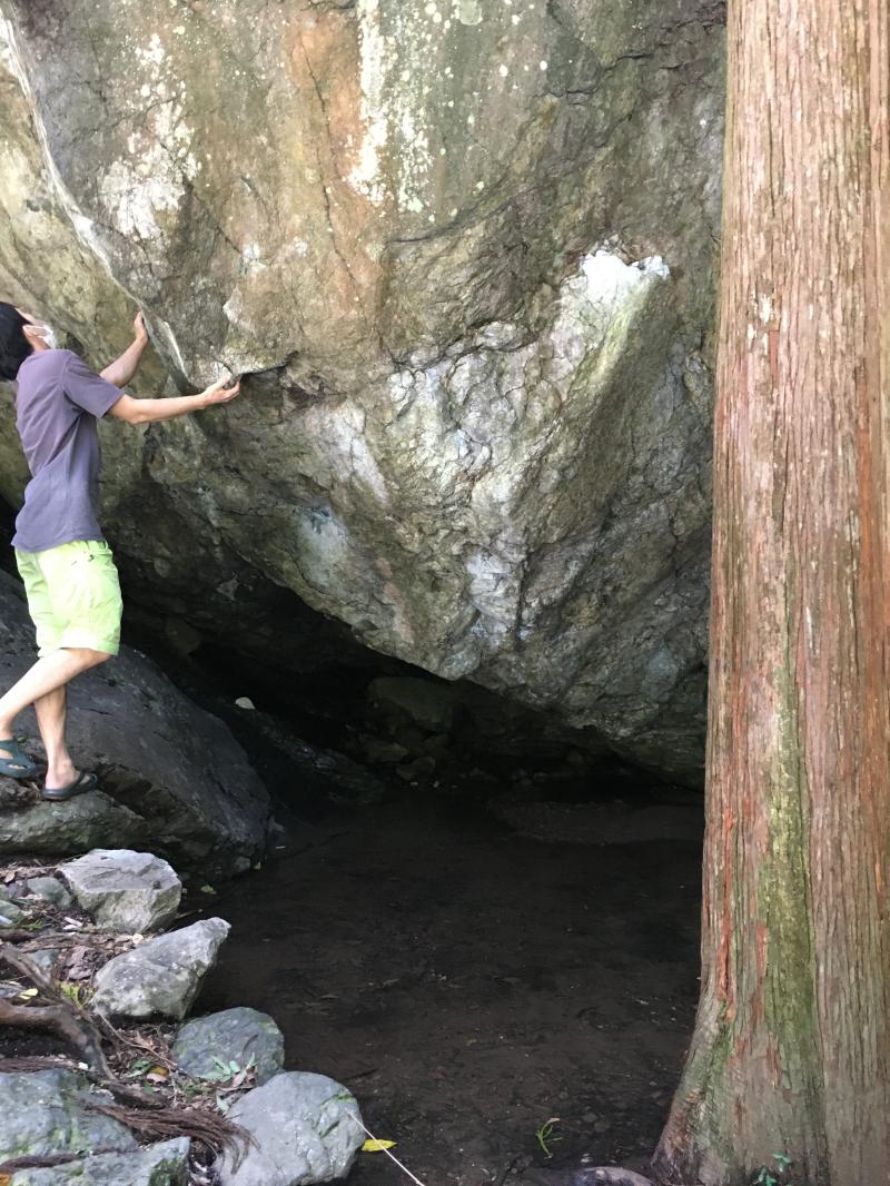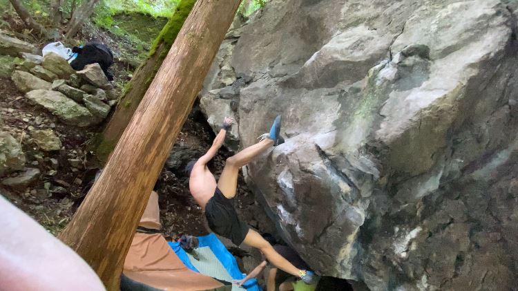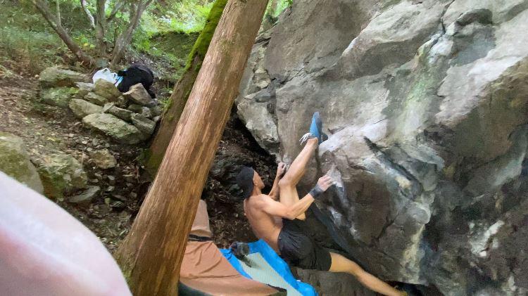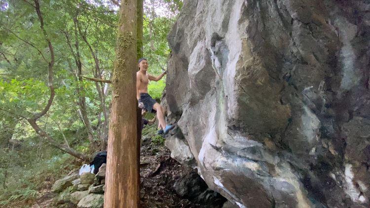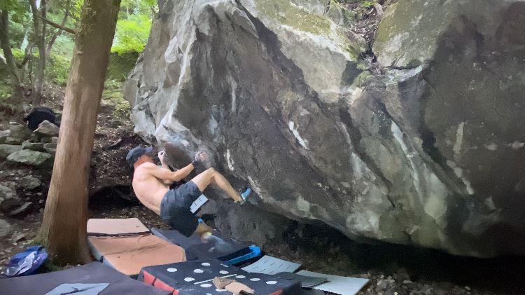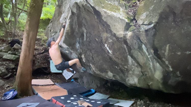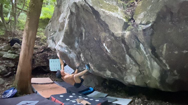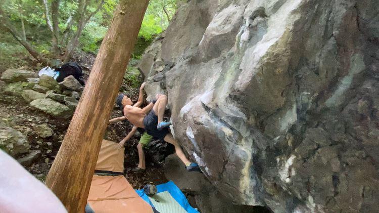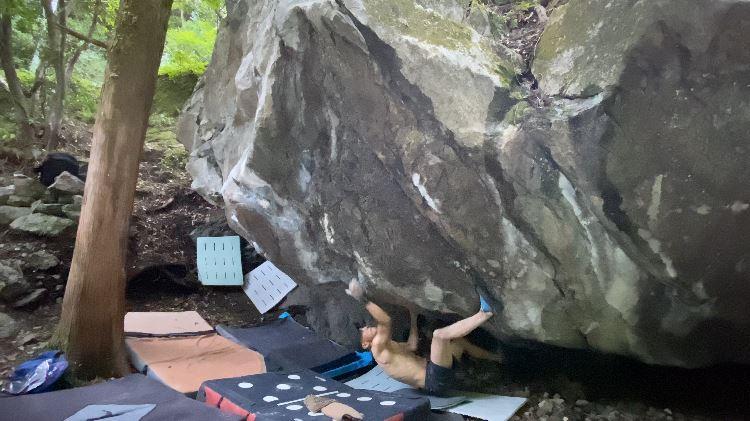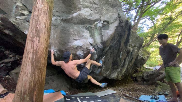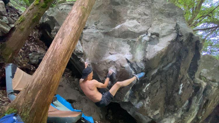 火消し岩は川からではなく山からの流れ込みによって下地が10cmほど完全に水没していました。ホールドは乾いていましたが、全ての課題が登れない状態。