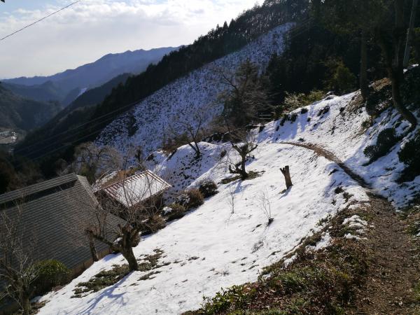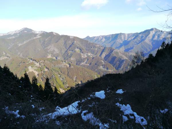 ここから東に進み松生山の分岐を左にとり時坂峠、払沢の滝バス停方面へ。尾根上の道を進むと、大岳山と御前山が見渡せる場所がありしばらく見とれてました・・・。しばらく進むと道は右に折れ谷に下りていきお蕎麦屋さんを過ぎると峠の茶屋に到着。