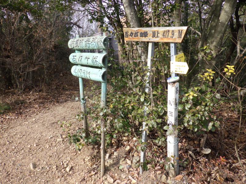 今日はこのまま周回する為に権現山経由で尾根を下りますが、登りがほぼ林道歩きでしたのでようやく登山道らしくなり、急坂です。遊歩道以外は通行できないので忠実に階段を辿り、まだ下がるのといった感じで一気に下ります。振り返ると三角のきれいな山が見えましたが、これは先ほどの権現山でした。百々ヶ峰にはアンテナがありますのであそこが山頂だとわかりますが、なければはっきりしない山頂です。この登山道は整備されていますが、長く、登ってきたほうが良いかもしれません。途中から遊歩道のようなグネグネした道が続き、一気に下りたい気分になります。