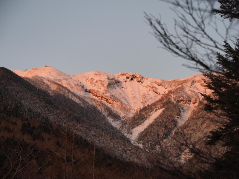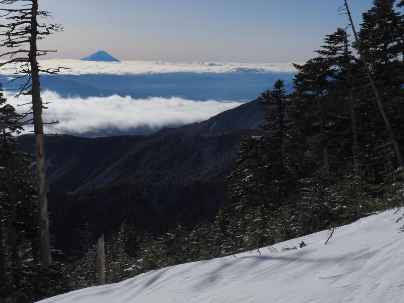 冬の杣添尾根。前日は大荒れのようで雪が結構降ったかな?と、人の少ない杣添尾根なので念のためワカン持参。日の出前は気温-10℃。久々のこの気温で出発準備中も冷えます。あまりに寒いので体が温まるまでハードシェルと厚手のグローブを身につけてスタート。日が登ってきました。横岳が照らされて赤く染まっています。少し歩いて体も温まったのでシェルを脱ぎ、薄手のグローブにチェンジ。標高の低いところはあまり降雪はなかったようで凍ったような感じなのでチェーンスパイクで登ります。少し標高が上がって振り返ると雲海と奥秩父の山々と富士山が綺麗ですが木々が多く写真は撮りづらい。久々の冬靴となかなかの斜度でペース上がらず。