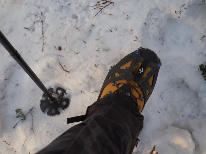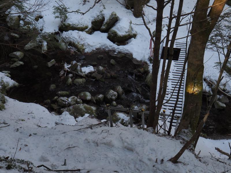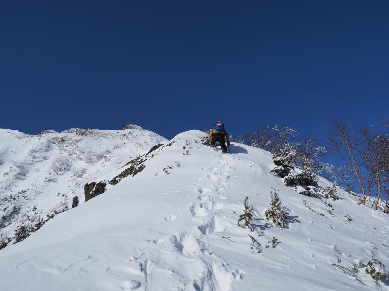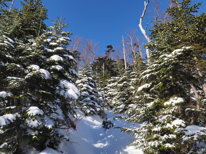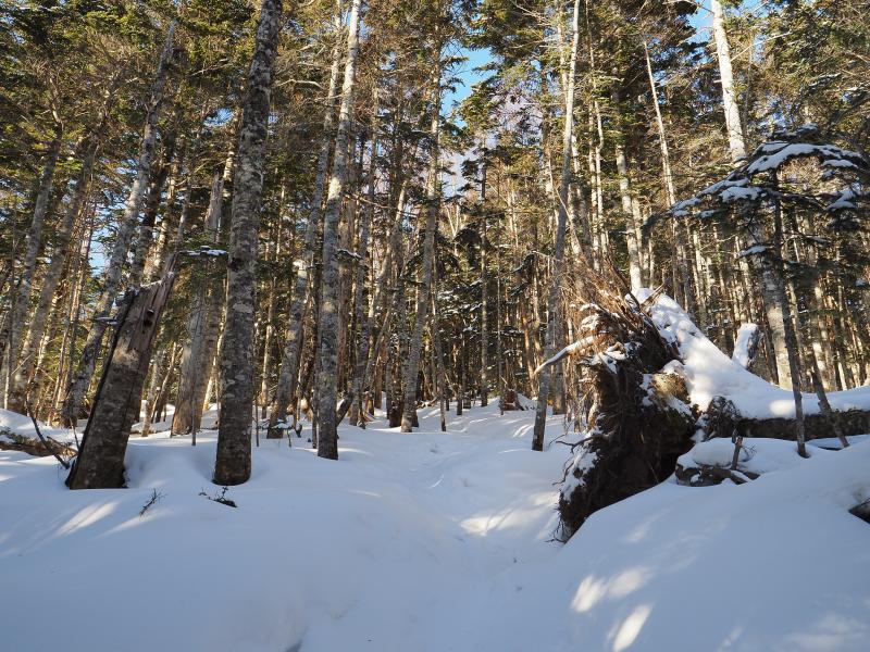 前日の降雪や吹き溜まりなど積雪量が増えてきて斜度も増してきてさすがにチェーンスパイクでは歩きにくくなってきたので2400mくらいの少し開けたところで12本爪アイゼンに換装。踏み外すと膝上まで埋まるところもありましたが、結局ワカン使うほどではありませんでした。
