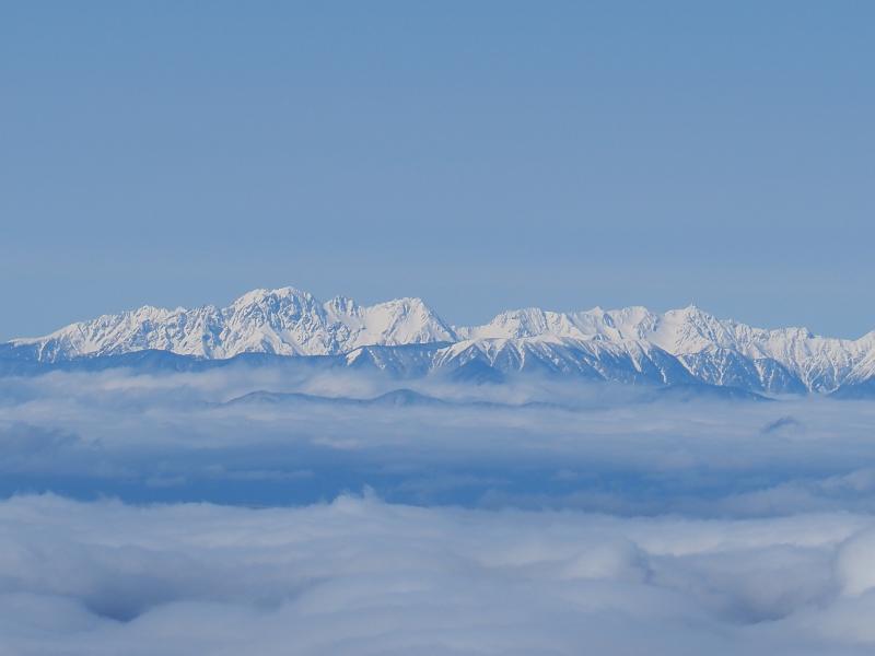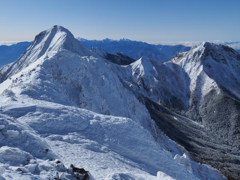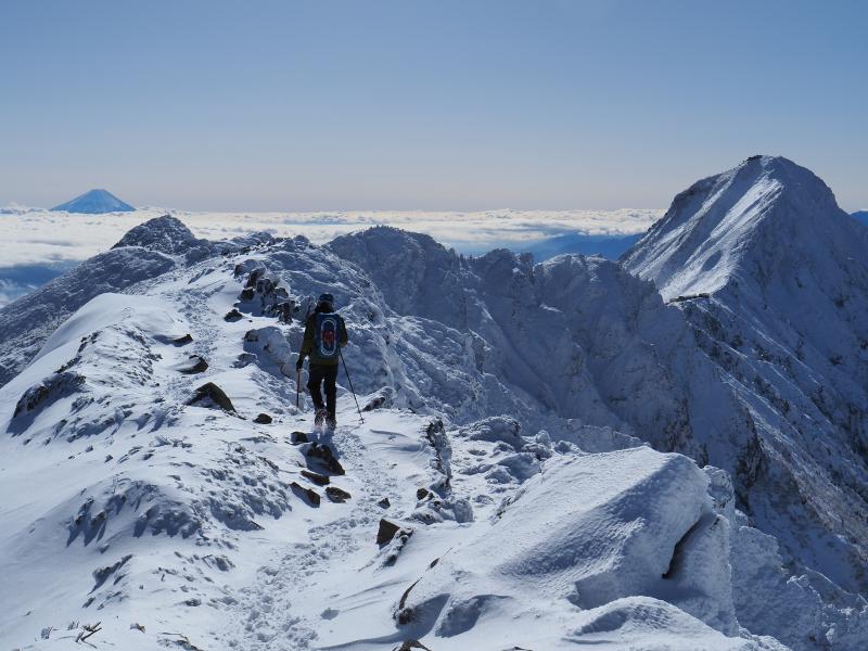 三叉峰に着くと大展望!富士山、赤岳、阿弥陀岳、南アルプス、中央アルプス、北アルプス、浅間山など上信越の山々などなど全てが真っ白。ここ最近は積雪が少なく心配でしたが、前日に降雪があるとまるで景色が違います。八ヶ岳でこんなに周りの山々が見えたのは久しぶりでした!すぐ隣の横岳へ。アイゼン付けていると梯子は歩きにくい。ここからの景色はダイナミック。稜線越しの赤岳、大同心、小同心、硫黄岳も真っ白。
