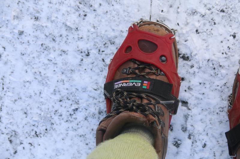 塩屋の街が道路凍結でアイスバーンでした。街でスパイクを付けて坂道を登ります。
