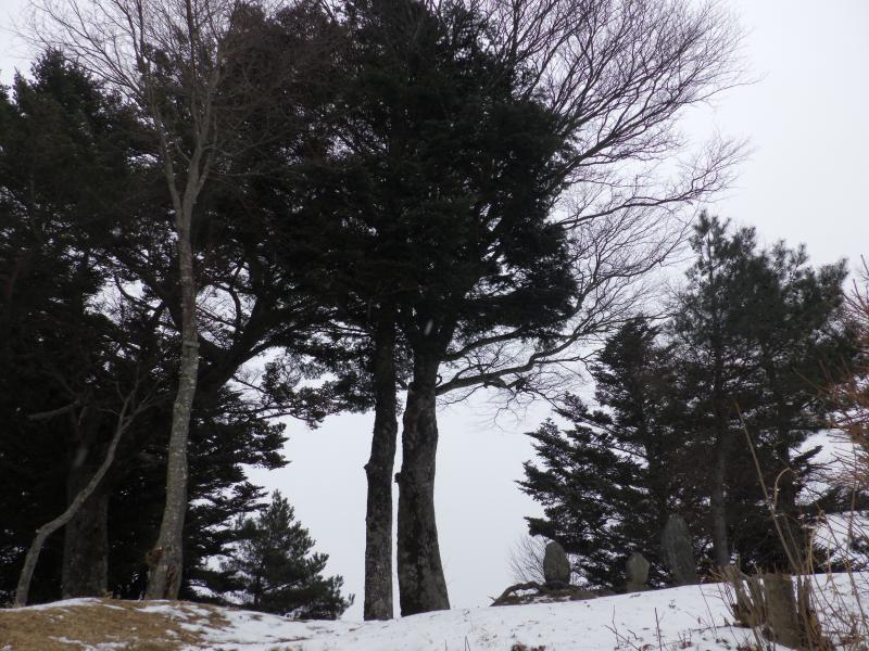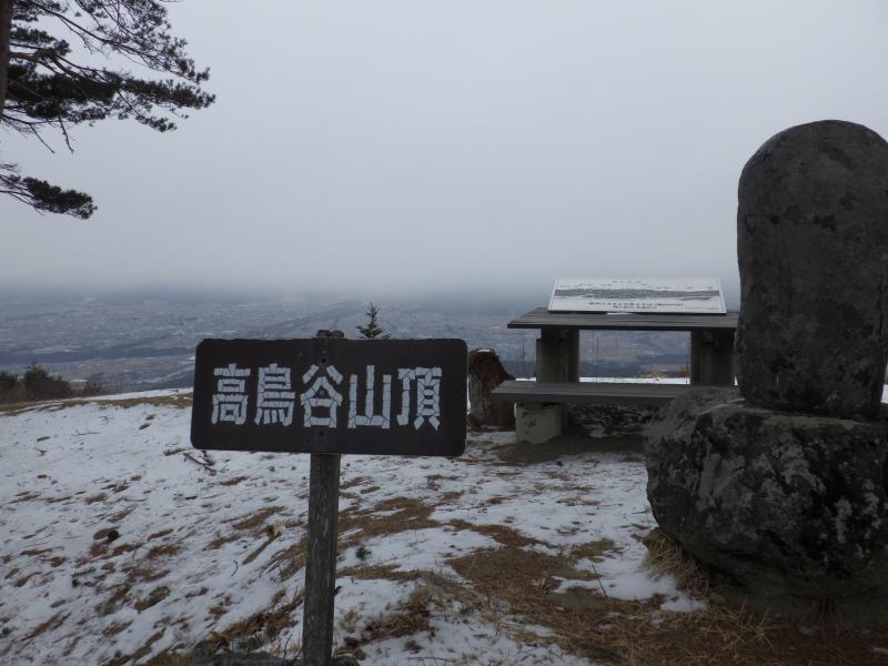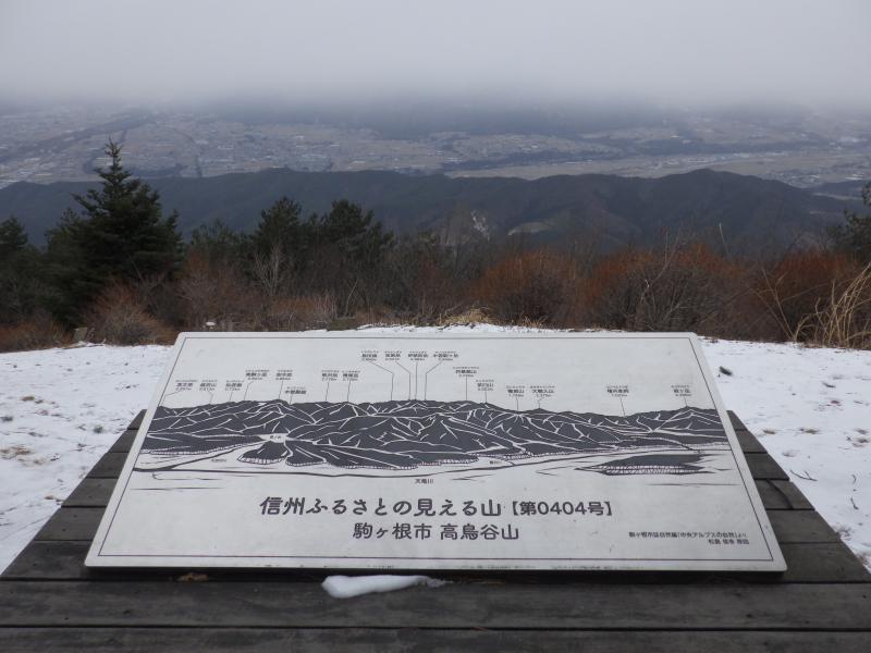 登山口にある高鳥谷神社は1772年から矢納という神事が毎年行われ、神社に繋がる参道に並び繁る社叢(赤松林)は、樹齢300年を超えます。高鳥谷神社から登るルートは尾根の一本道で途中から急になります。岩場はほとんどないですが、雪が薄くついている為にツルツルで、最初からチェーンアイゼンが有効です。朝方はまだ視界がありそうだったが、山頂に着くと既に駒ヶ根市街はガスが立ち込めて、中央アルプスの稜線もはっきり見えず、雪もちらついてきました。本来ならここから絶景が広がる山ですが、残念です。