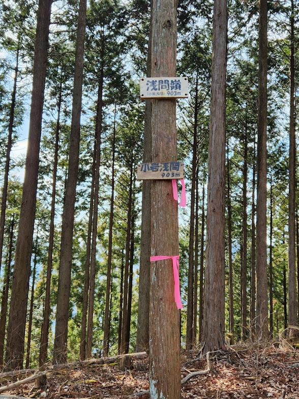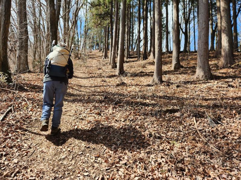払沢の滝を見てマイナスイオンを浴びたら、そのまま林道を歩いて浅間嶺に向かいます。久しぶりの山友達との再会で、山歩きよりもお互いの近況を語り合うのに夢中になり、いつの間にか逆側の尾根へ進み、山頂へ到着するまで大幅に時間をロスしてしまいました。そんな状況も楽しみつつ、近くには慣れ親しんだ御岳山、奥の方には最高峰の雲取山なども顔を出し、春霞みの中穏やかな奥多摩歩きを満喫しました。