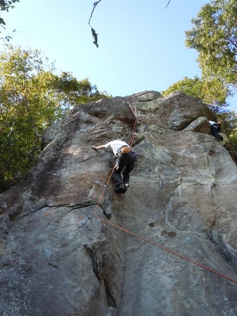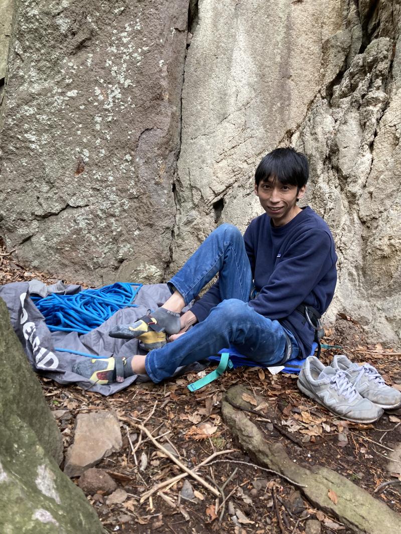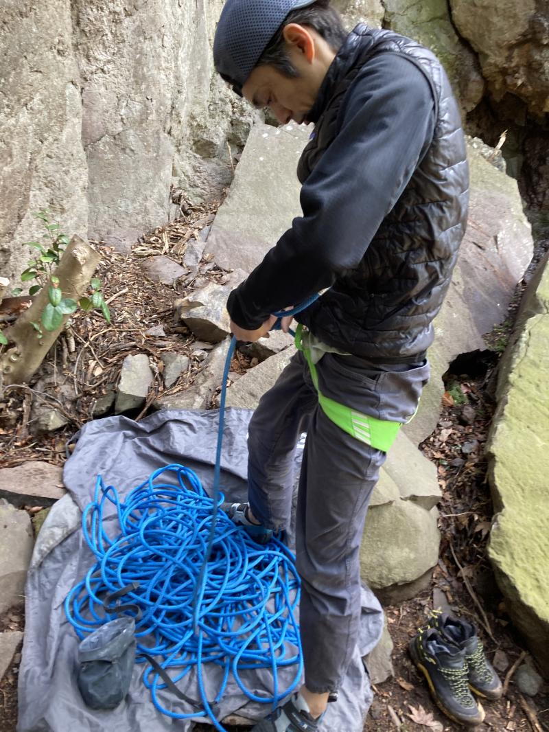 壁は西面のため、取り付きは午前中は日が当たらず、登っていない時は全てを着こんでいました。日が当たり始めると日向はかなり暖かく、Tシャツ1枚でも快適。
