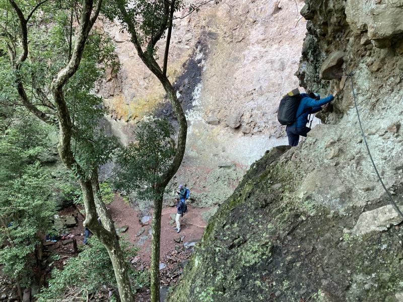 岩場が近づいてくると道が険しくなり、切れ落ちた崖にフィックスロープが張られた箇所が出てきます。雨上がり時はぬかるんで滑りやすく、滑落すると助かりませんので細心の注意を払ってください。