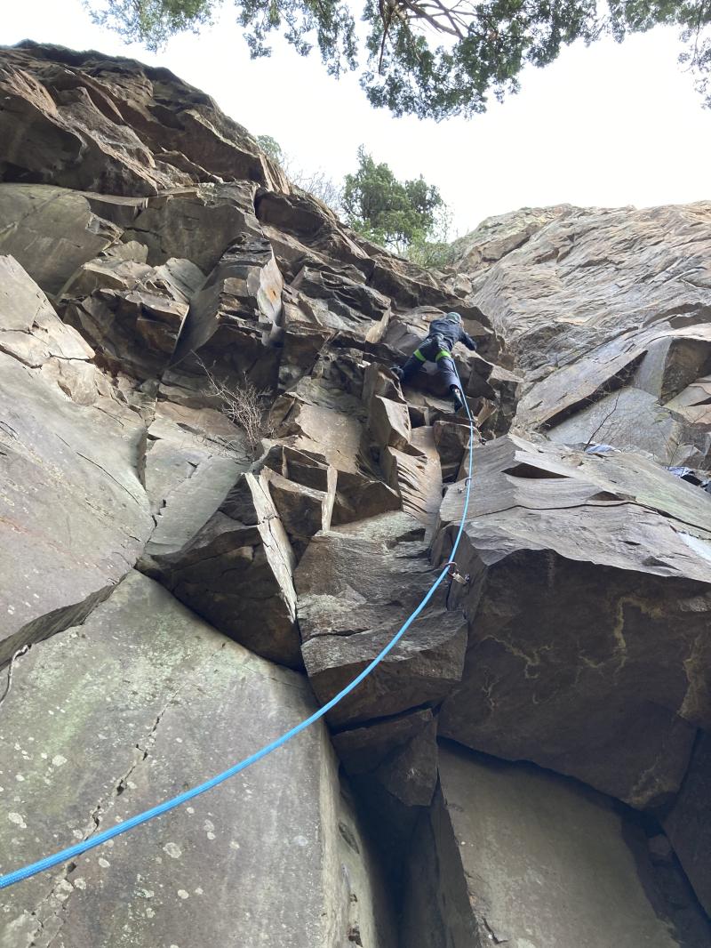 岩質は礫岩と安山岩。まだ安定しているとは言い難く、浮いているホールドが多くあります。崩れることもよくありますので、岩壁基部で休憩する際やビレイの際はヘルメットを着用しましょう。私は直径5cmほどの落石を腕と足に受けて擦り傷を作りました。