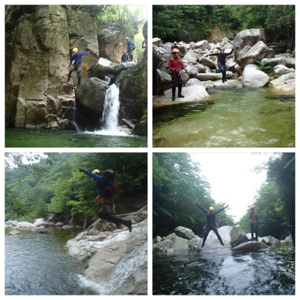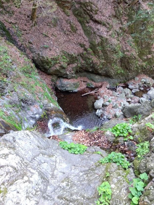 まずは15メートル滝。左のドライな岩登りとなります。慣れ親しんだ石灰岩ですが、沢登りとしては、初めてかもしれません。2つほどハーケンは確認できました。その後は少し上がると、25m大滝。