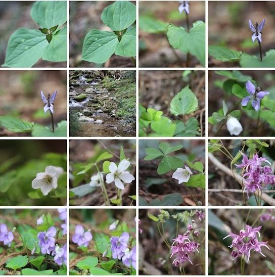 登山口 は イカリソウ、ミヤママタバミの群生、スミレサイシン、オオタチツボスミレ、キクザキイチゲ ヤマシャクヤクの葉から始まります。