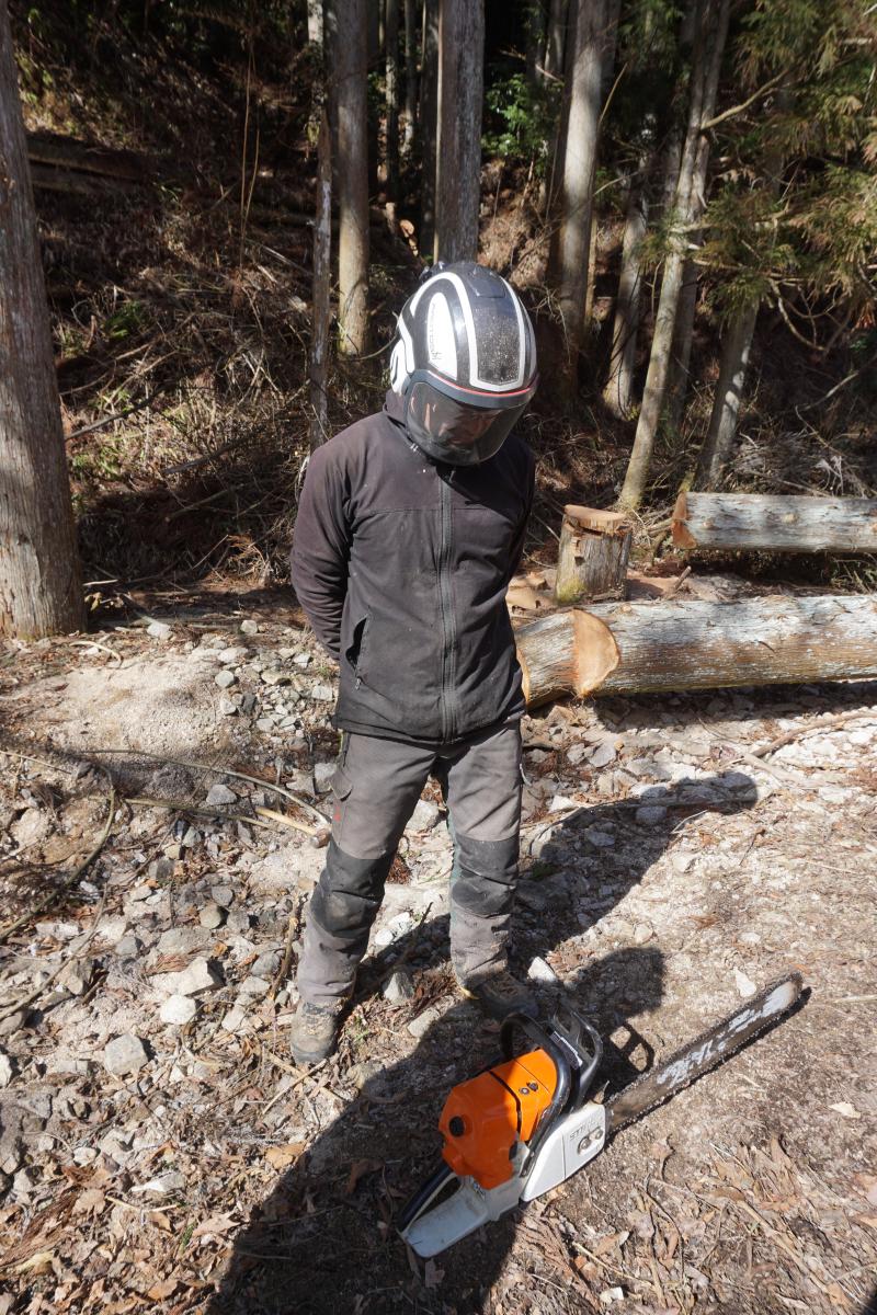 顔回りは木くずが目に入らないよう、チェーンソーヘルメットで完全防備!