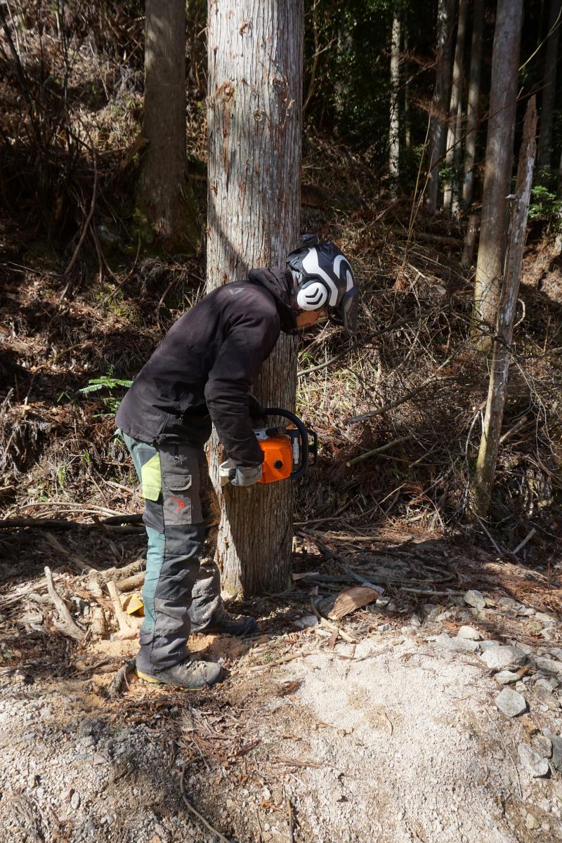 とはいえ、いきなり大きな木を素人が切り倒すのは危険なので、まずは職人さんに見本をみせて頂きました。大きくミシミシと音をたて、まるでスローモーションのように大きな樹が倒れ込むシーンは想像していたよりもかなり迫力がありました。